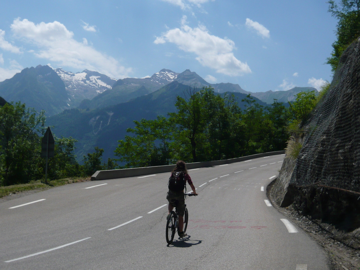 Die Spionin hat den Biketrip auf die Crete Moliere gestern gut verkraftet, drum nehm ich sie heute mal mit nach Alpe d'Huez. Warum nicht gleich einen bekannten Anstieg als ersten ernstzunehmenden Uphill. Unsere Vorbereitung ist allerdings alles andre als vorbildlich, in der Nacht zuvor ist mal wieder große Party in der Jugendherberge. Vor drei kommt keiner ins Bett, und der billige schwedische Himbeervodka macht die Sache heute morgen auch nicht leichter. Ich finds trotzdem lustig... irgendwo allein in einem düsteren Canyon übernachten ist toll, sich die Nacht mit Trinkspielchen vertreiben ebenso.