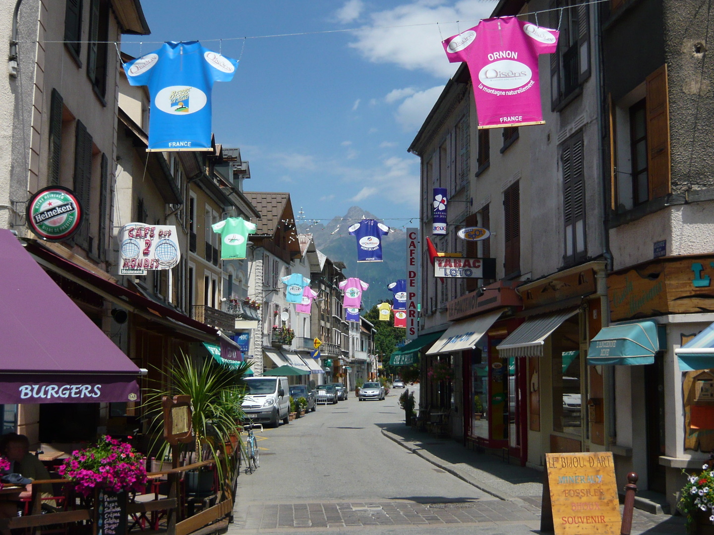 Bourg d'Oisans, schon geschmückt für das baldige Gastspiel der Tour de France.