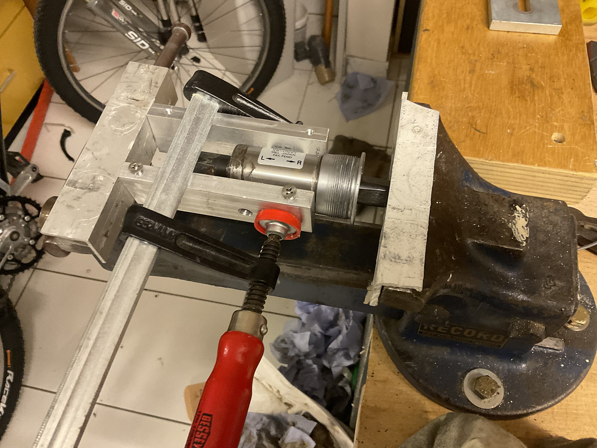 Man sieht meinen Schraubstock( mit Schonbacken ), Zwei Alustücke gleicher Länge, mit Schraubzwinge leicht am Tretlager angedrückt. Den Schraubstock zuschraubend bekommt man die Hülse recht gut abgedrückt.