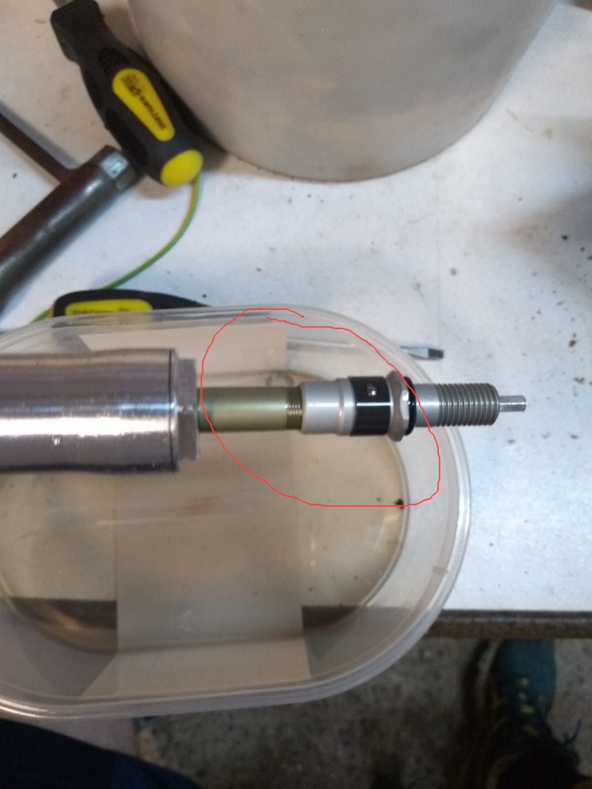 Ich hatte vor einigen Wochen einen Service durchgeführt und festgestellt, dass die der Rebound Einsteller, bzw. sich die Komplette Einheit von dem Schaft gelöst hat und das komplette Öl aus der Kartusche gelaufen ist. Das ganze muss während der Fahrt passiert sein. Siehe Bild.