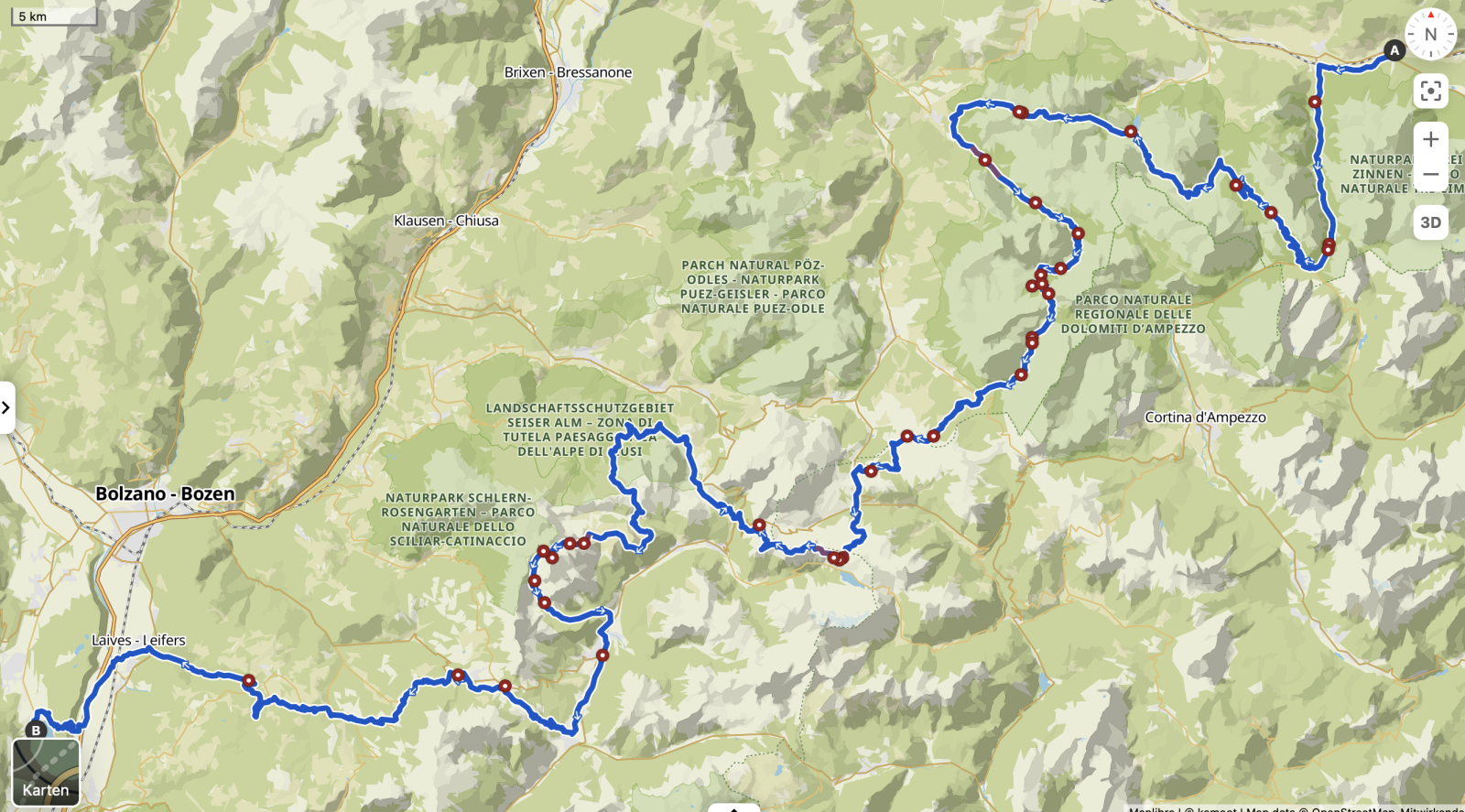 Servus zusammen, leider reicht es dieses Jahr zeitlich nicht für eine Transalp und so kam die Idee auf 4 Tage mit dem Bike in den Dolomiten zu verbringen. Am liebsten möchten wir keine Rundtour fahren und haben jetzt mal die nachfolgend beschriebene Variante grob skizziert.