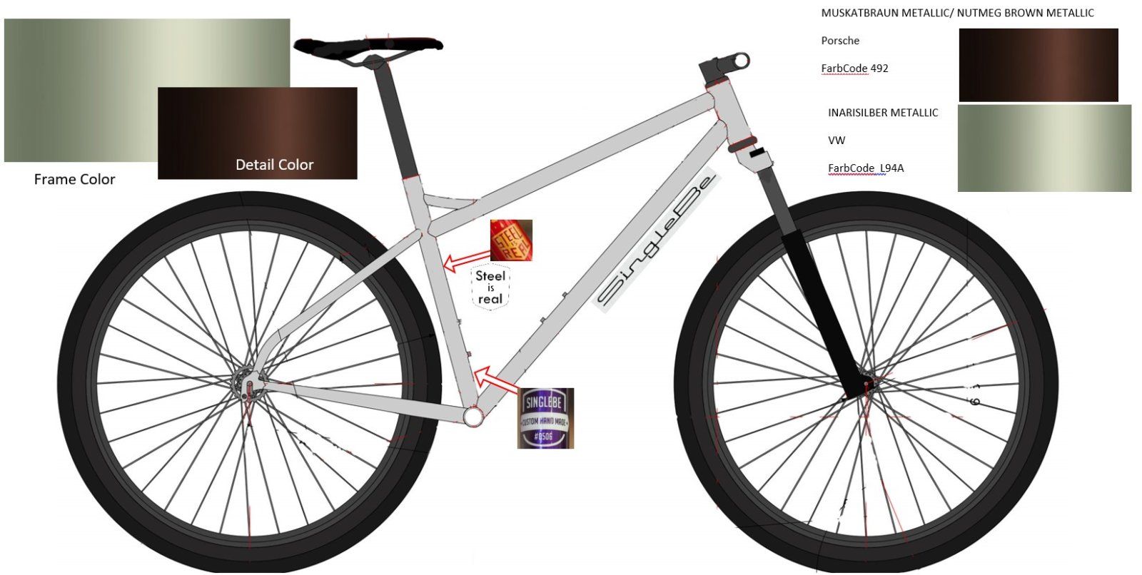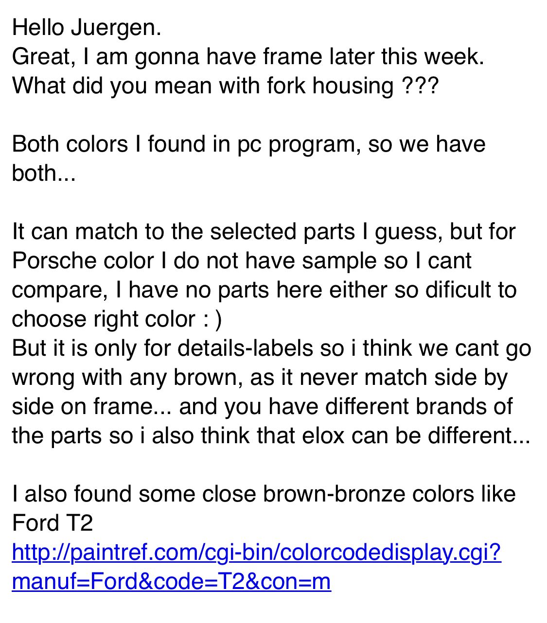 Tom wird eine ähnliche Braun-Bronze Farbe "FordT2" wählen, passt besser zu den Eloxaltönen von Wolf Tooth..also anders als oben gezeigt die Porsche Farbe.