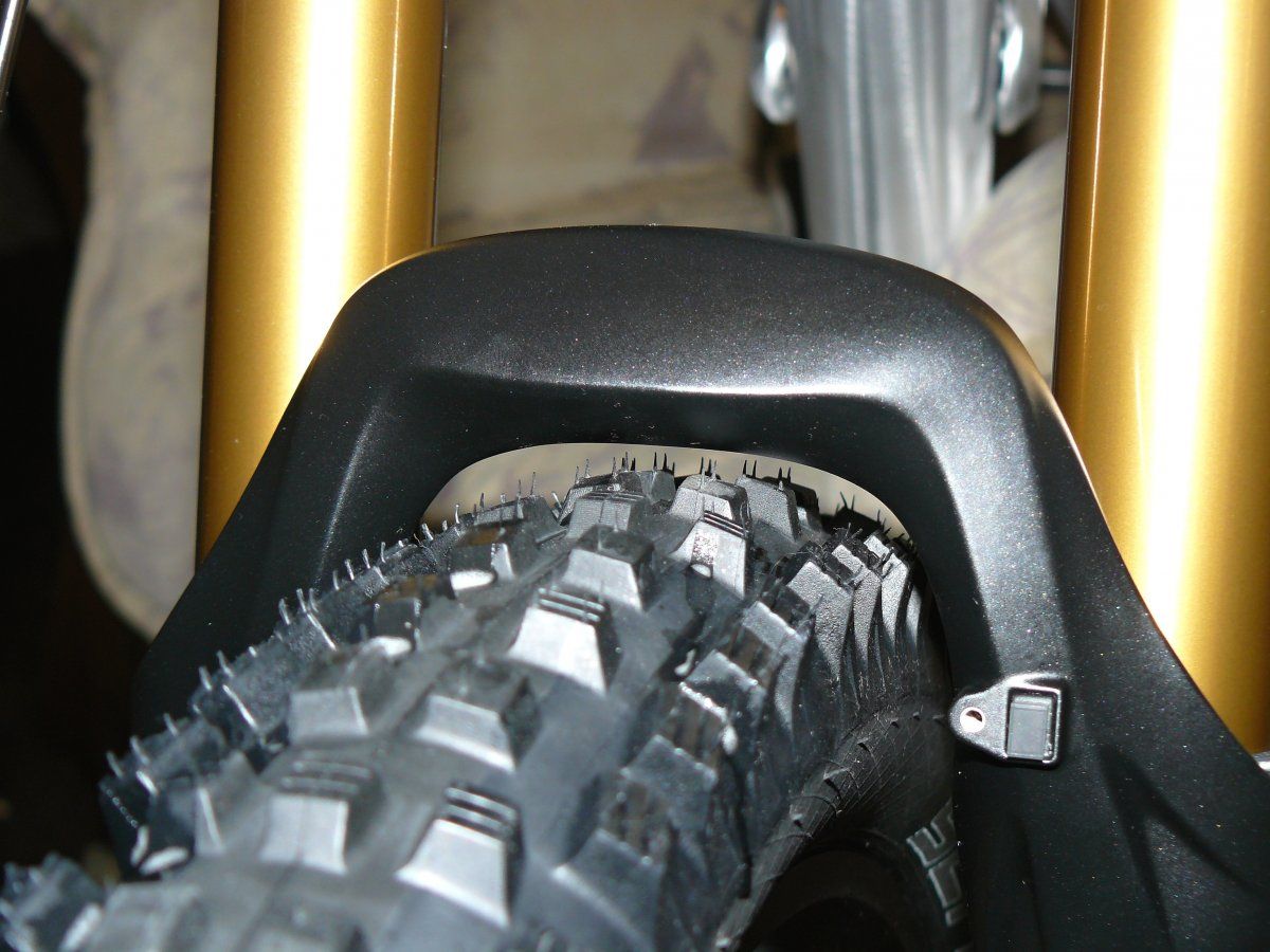 könntest Du einmal alle luft aus der gabel ablassen und mit vollem körpergewicht einfedern - und dann prüfen, ob der Reifen oben die Gabelkrone berührt (also im Prinzip den boden des steuerrohrs)Fox Talas 180 2014 + Syntace W35 + Magic Mary 650B