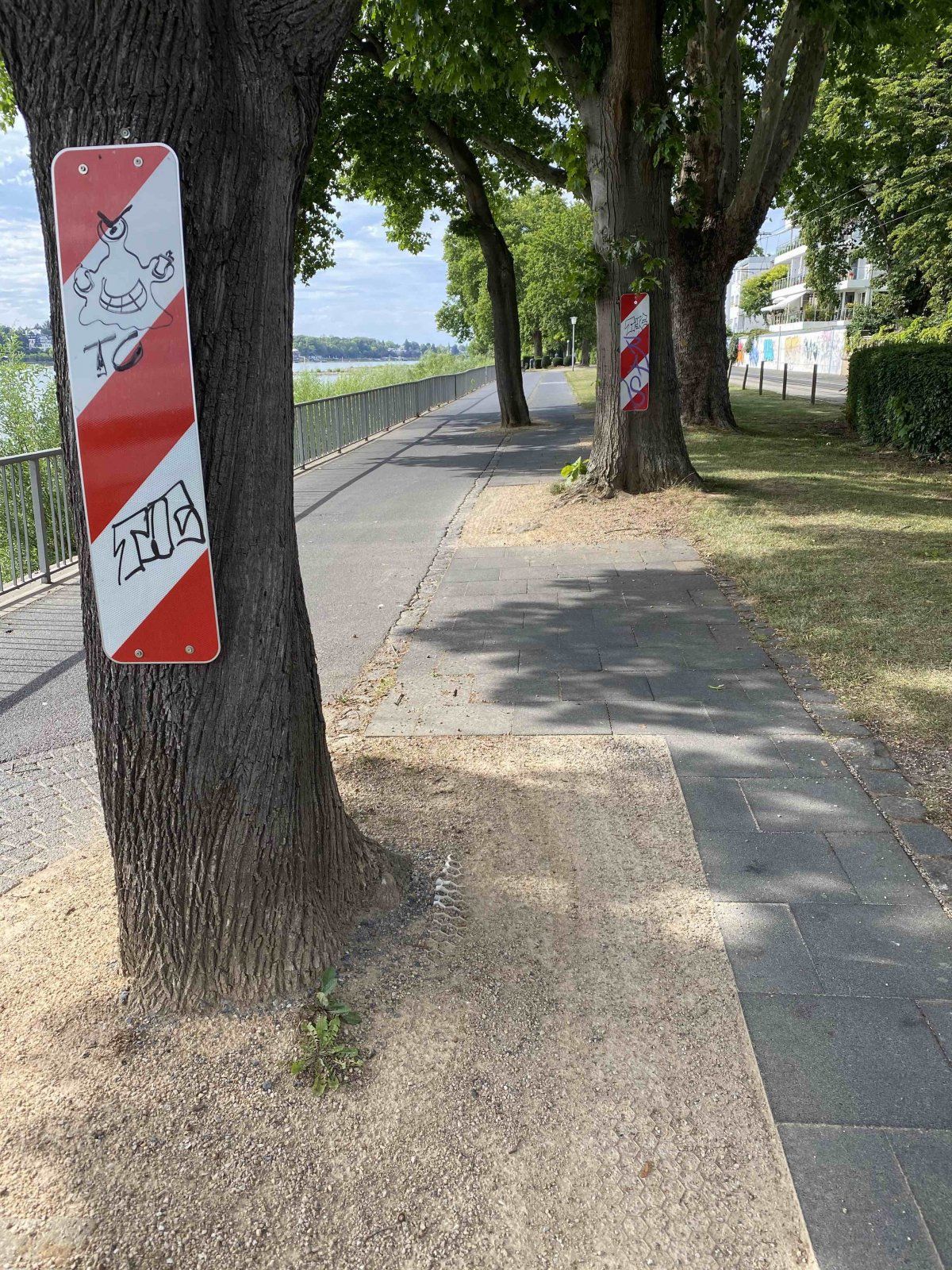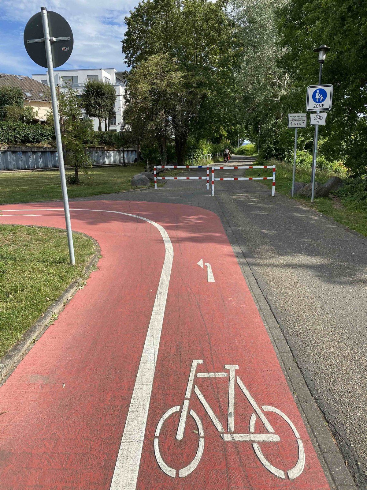 Weiter geht es. Die gesamte Promenade wurde (nach meiner Wahrnehmung erst vor kurzem) zu einer Fußgängerzone erklärt. War es nicht vorher ein kombinierter Fußgänger & Radweg? Baulich wäre es auch überhaupt kein Problem sogar beides komplett zu trennen. Denn direkt am Rhein könnten die Fußgänger laufen, parallel zur Straße die Radfahrer fahren. Rheinabwärts wüsste ich gar nicht, wie man den Bereich umfahren sollte und nicht weit vom Rhein weg fährt. Rheinaufwärts gibt es eine lustige Umleitung, die mich beim Befahren am Sonntag zur Hauptstraße führte. Es ist der Wahnsinn, entlang eines Fahrradwanderwegs am Rhein schneidet eine Gemeinde die Fahrradfahrer einfach von der Route ab. Wenn man sich den vorher ausgewiesenen "Radweg" ansieht - der in beide Richtungen befahren werden sollte, kann man sich bildhaft vorstellen, was dort an sonnigen Sonntagen abgeht / abging. Aber anstatt eine bauliche Lösung im Sinn aller (!) Nutzer zu suchen, werden die Radfahrer ausgesperrt. Die Poller stehen rheinabwärts im übrigen so eng, dass man mit einem 2-sitzigen Fahrradanhänger nicht durch kommt
