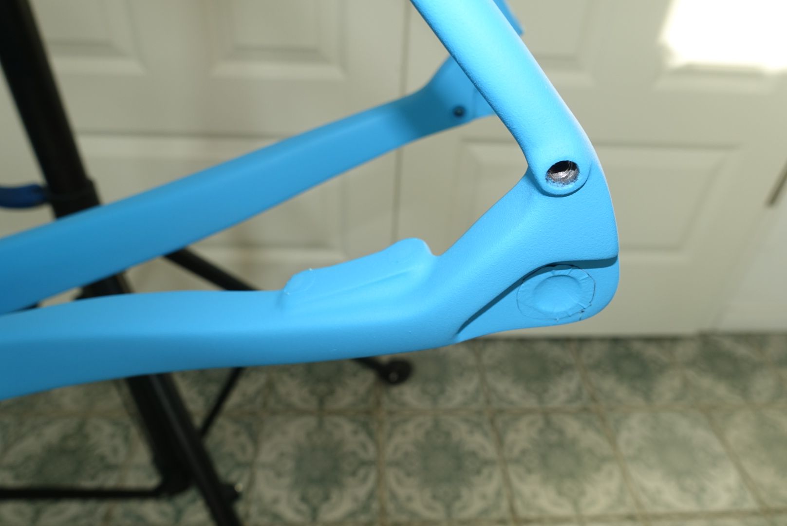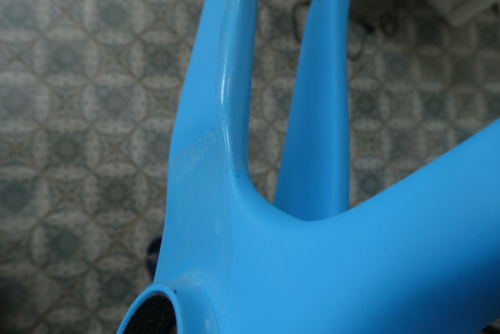Nachdem ich Bereiche mit 800er Schleifpapier leicht glatt geschliffen habe (vor dem Wachsen) hielt dann sogar die Schutzfolie am Unterrohr, Tretlager und Kettenstrebe