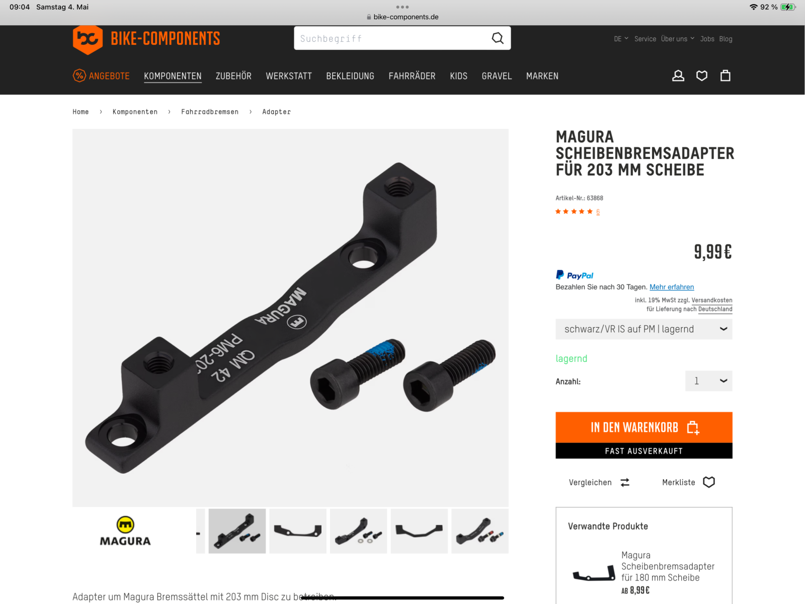 Das sieht aus wie der Bremsscheibenadapter für die 220 mm Scheibe, du hast aber eine 203 mm Scheibe. Auf der Seite von Bike Components gut zu erkennen