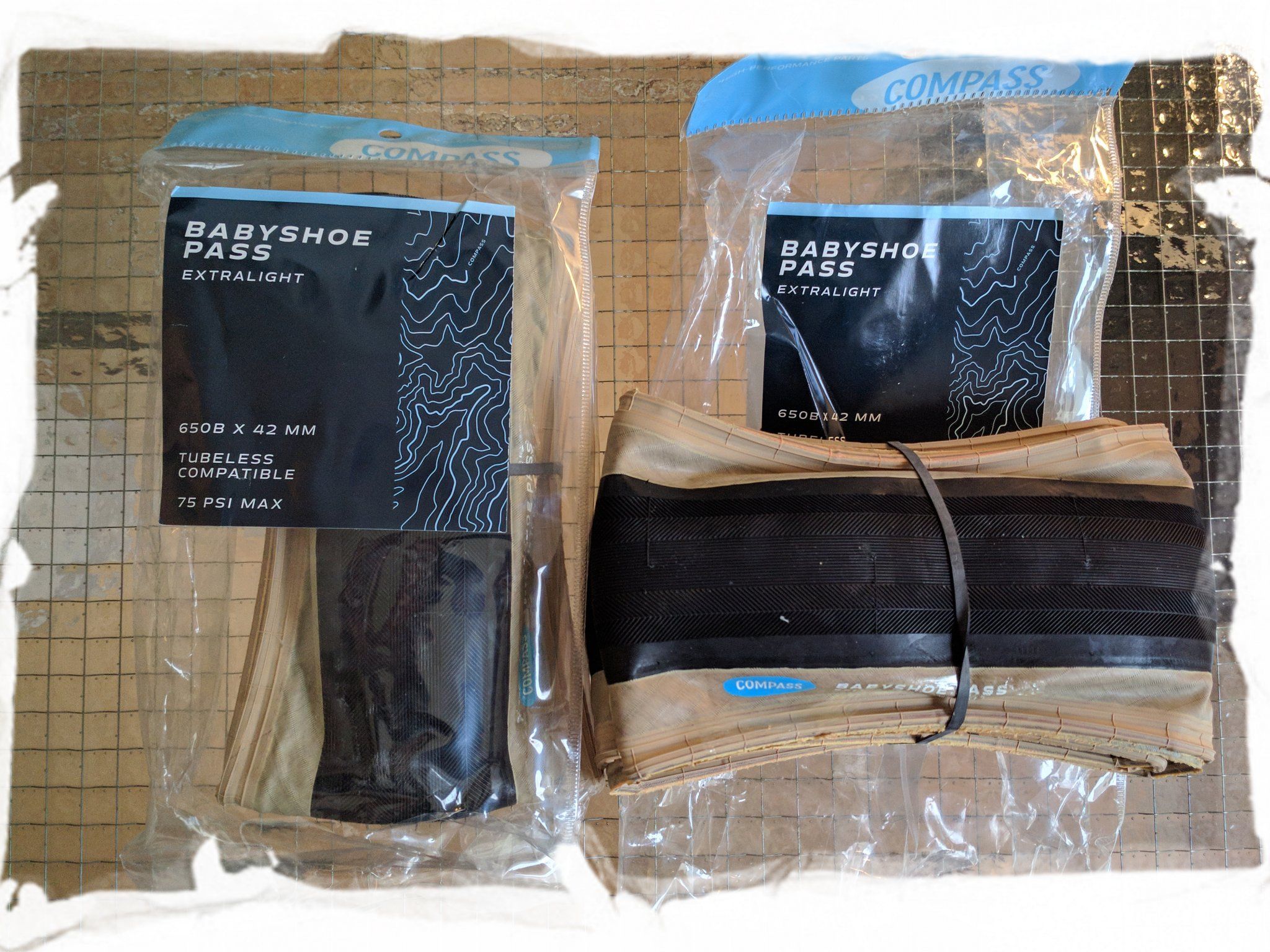 Aber zurück zur Reifenfrage. Gäbe es den Soma Cazadero (schon) Tubelessfähig in 650b hätte ich wahrscheinlich ohne Zögern zugeschlagen – und die Somaten werden mit der Zeit sicher etwas derartiges anbieten. Da der Caz nicht in Frage kam, habe ich meine (finanziellen) Bedenken beiseite geschoben und mir einen Satz des leichten Compass Babyshoe Pass in 42er Breite bestellt. Erst wollte ich den fetteren Switchback ordern, wovon ich aufgrund einer möglichen Verwendung an zwei anderen Rädern aber absah. Auf die Pellen bin ich gespannt – auch wenn sie wahrscheinlich erst bei besseren Temperaturen aufgezogen werden.