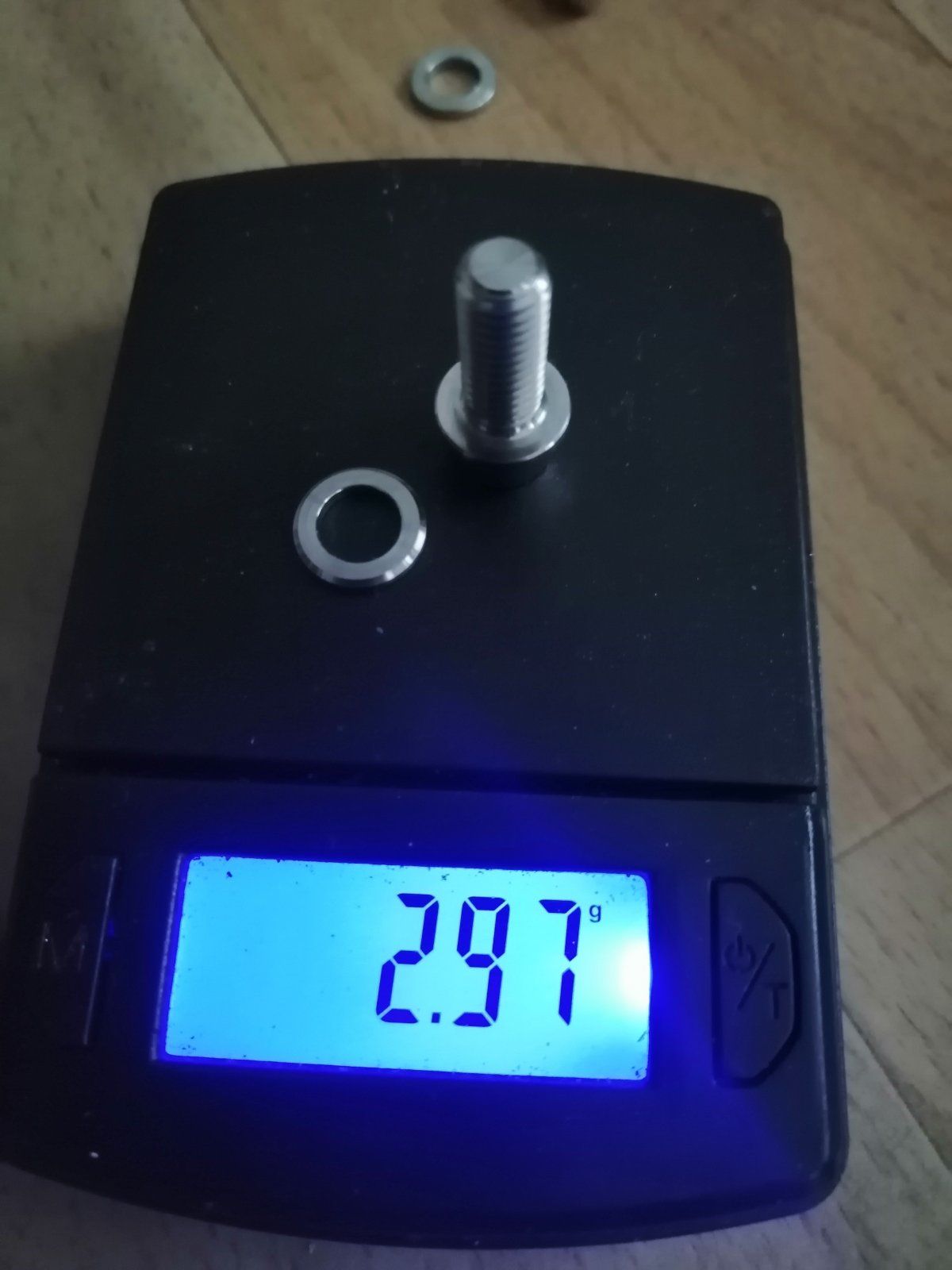 Was die Schrauben an Gewicht einsparen weiß man noch nicht - aber eins steht fest - in Sachen Gewicht / Preis sind sie wohl am schlechtesten.. Immerhin knapp 60 Taler für 4 Schrauben + U-Scheiben.