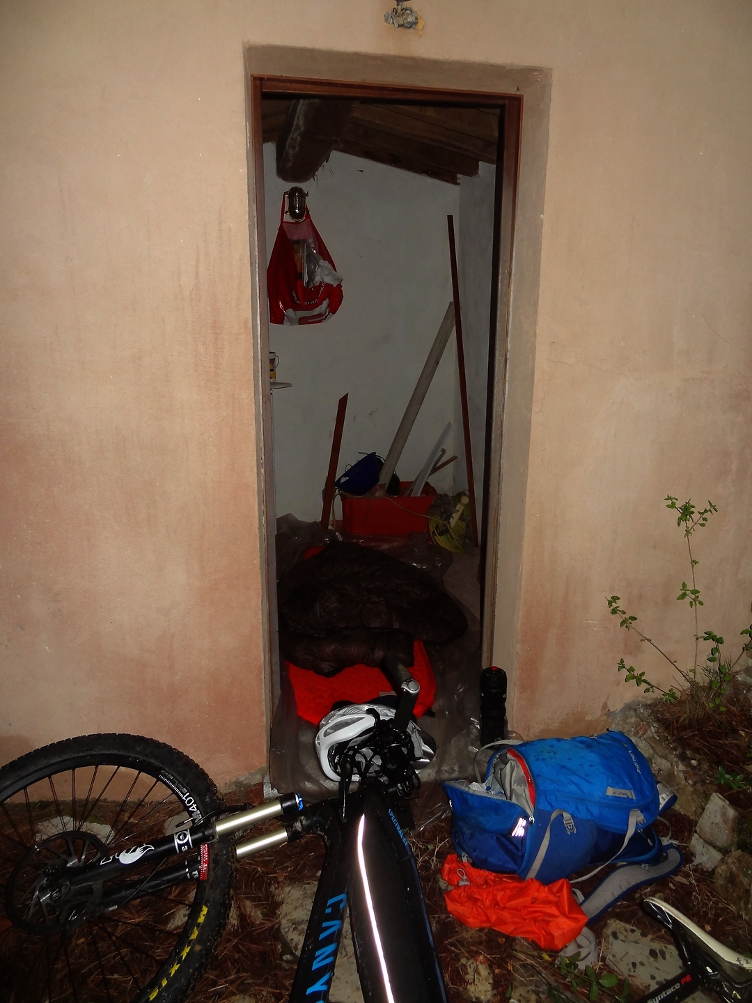 Schlafplatz Plan B, zehn Minuten später in einem alten Minimalschuppen: etwas weniger romantisch, aber immerhin trocken. Die ganze Nacht über jagt ein Gewitter das nächste, es regnet quasi ohne Unterlass. Auch heute morgen muss ich noch eine kurze Unwetterpause anpassen, um die zehn Minuten zurück zur Frühstücksbar in Marina del Campo trockenen Reifens zurückzulegen. Jetzt bei Cappucco und Croissants siehts draussen immer noch halbwegs finster aus. Was soll das? Hatte gar nicht gewusst, dass es auf Mittelmeerinseln schlechtes Wetter haben kann. Naja... die Sonne wird die Wolken schon bald wegbruzzeln.