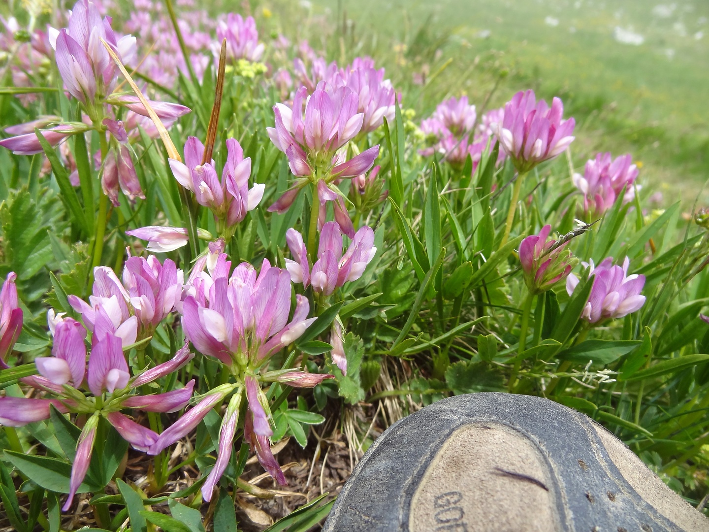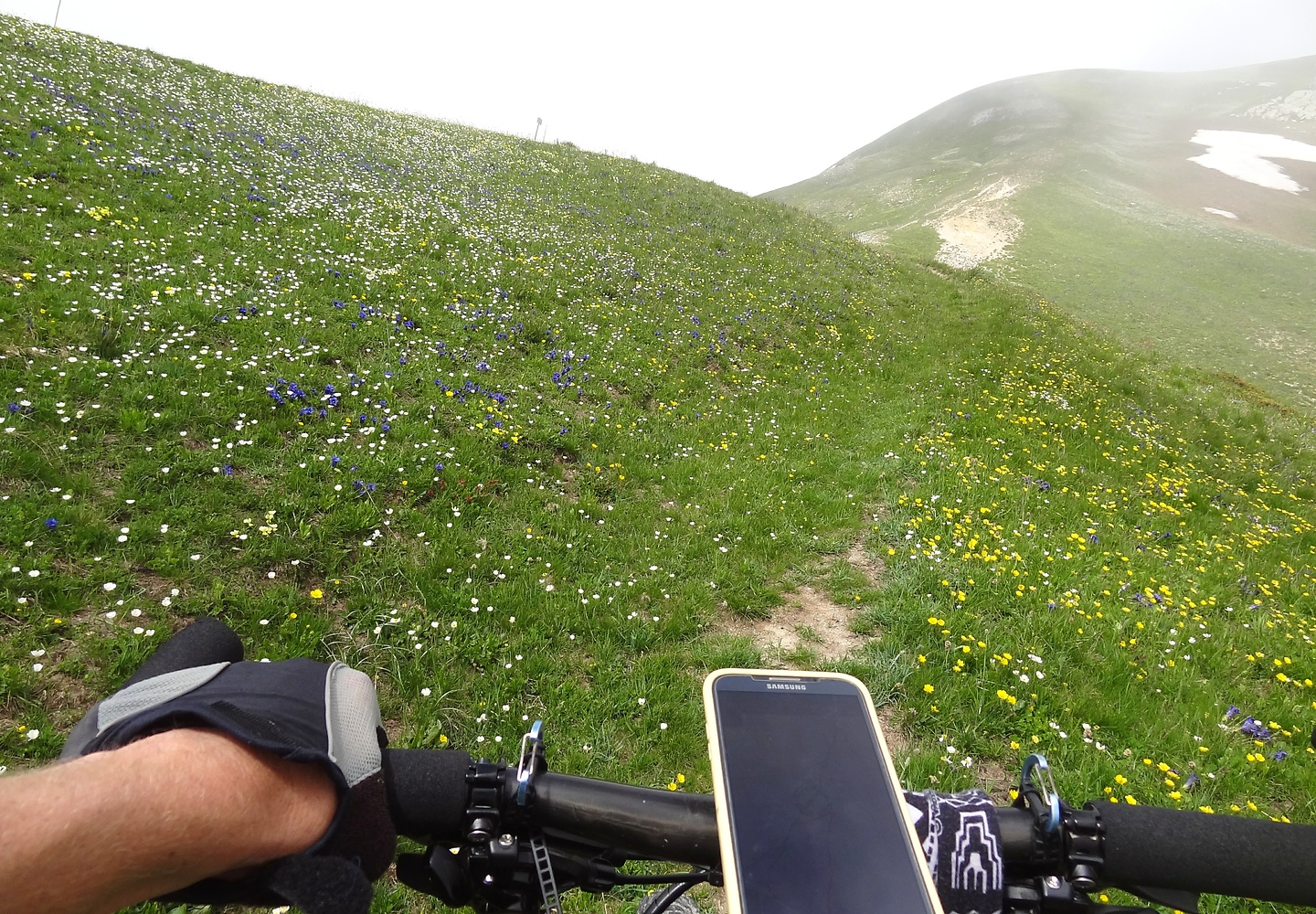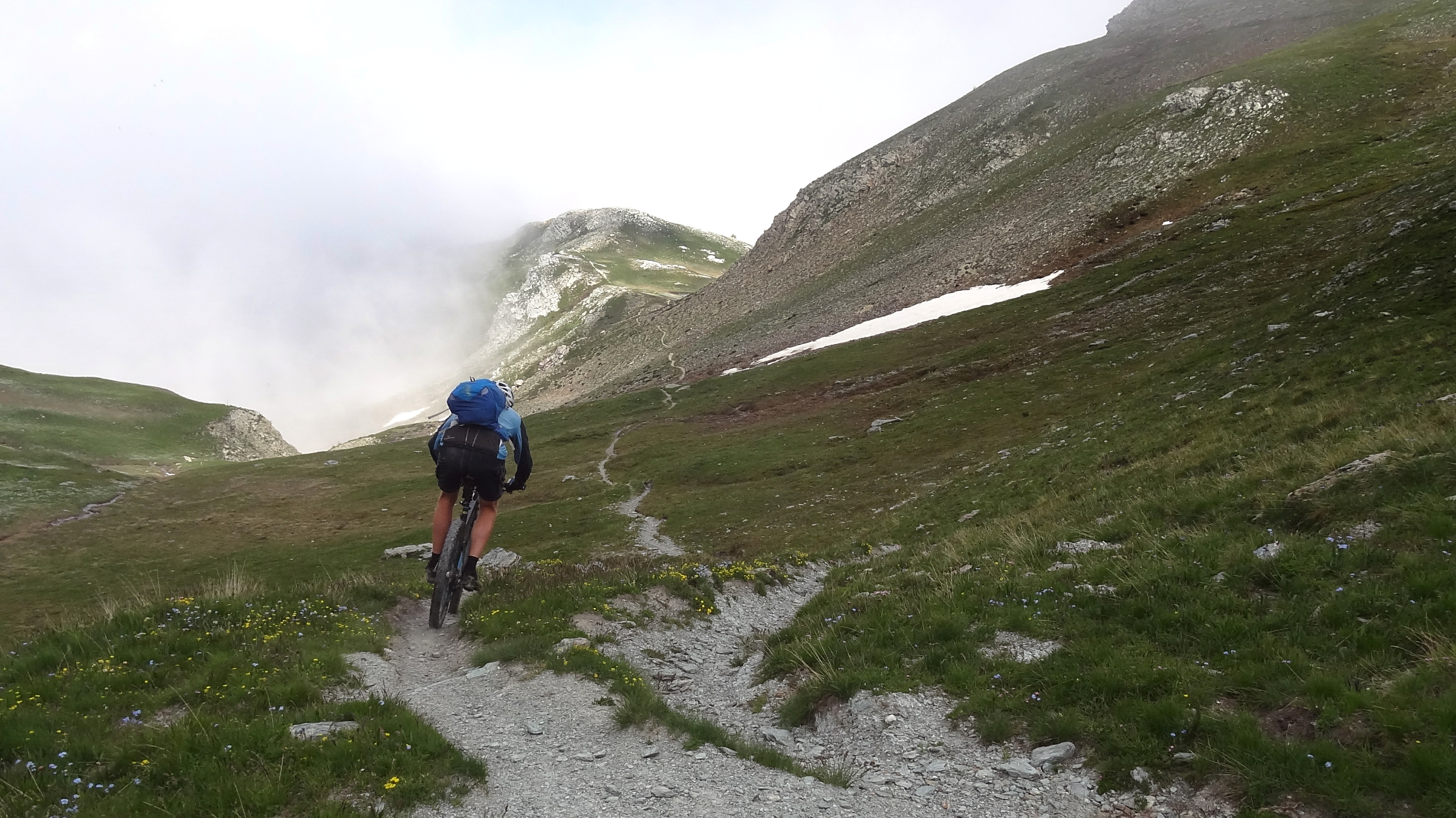 Kurz hinterm Colle Intersile seh ich sogar mal ein Stückerl, aber das wars dann auch schon. Bald hat mich der Nebel wieder... und zwar so dick, dass ich auf den nächsten sechshundert Höhenmetern hinab zu einer Alm kein einziges Buidl mehr mach. Schadet nix, man hätte sowieso recht wenig gesehen. Der Trail bleibt allerdings fast so esseinsflowig wie oben und ich brezl einfach ohne anzuhalten durch ohne mich um das nicht vorhandene Panorama zu kümmern... auch mal heil.