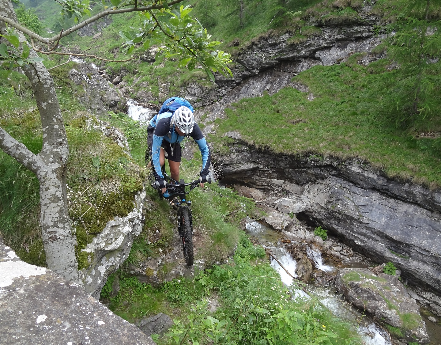 Als der Pfad wieder auftaucht, befinde ich mich in einer engen Schlucht. Das Niveau wird deutlich härter, entgegen der Einstufung auf der Karte. Oben S1, unten S2, nicht umgekehrt, so wird ein Schuh draus. In dem Canyon ist nicht viel Platz neben dem Bergbach, da sind schon ein paar gewaltig enge Serpentinen und steilere Stückerl zu überwinden... macht Laune!