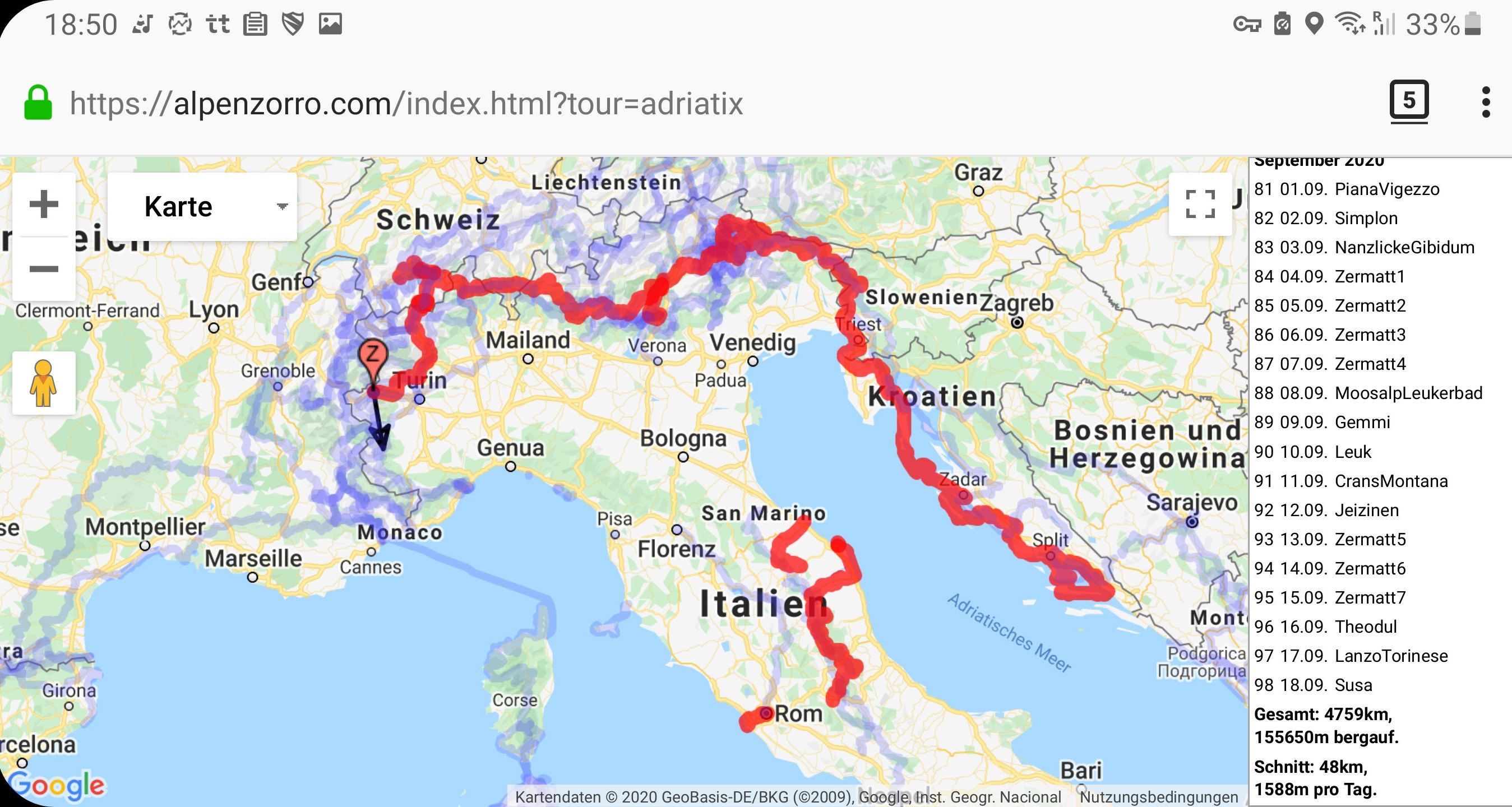 Von den Daten her hat sich der Adriatix inzwischen trotzdem beachtlich gemausert: Wir kratzen an den fünftausend Kilometern und die zweihunderttausend Höhenmeter fallen vielleicht auch noch. Der 1600er-Tagesschnitt ist offensichtlich dem Wallis geschuldet, da sind jetzt sicher ein Dutzend Downhilltage mit Seilbahn und Postbus dabei. Realistisch gesehen dürften wir da etwa bei 1300 liegen. Dafür das alles so pandemisch-unsicher begonnen hat, wird's langsam eine stattlich lange Tour. Mal sehen wie lange wir noch weiter strampeln dürfen... der nächste Lockdown kommt bestimmt.