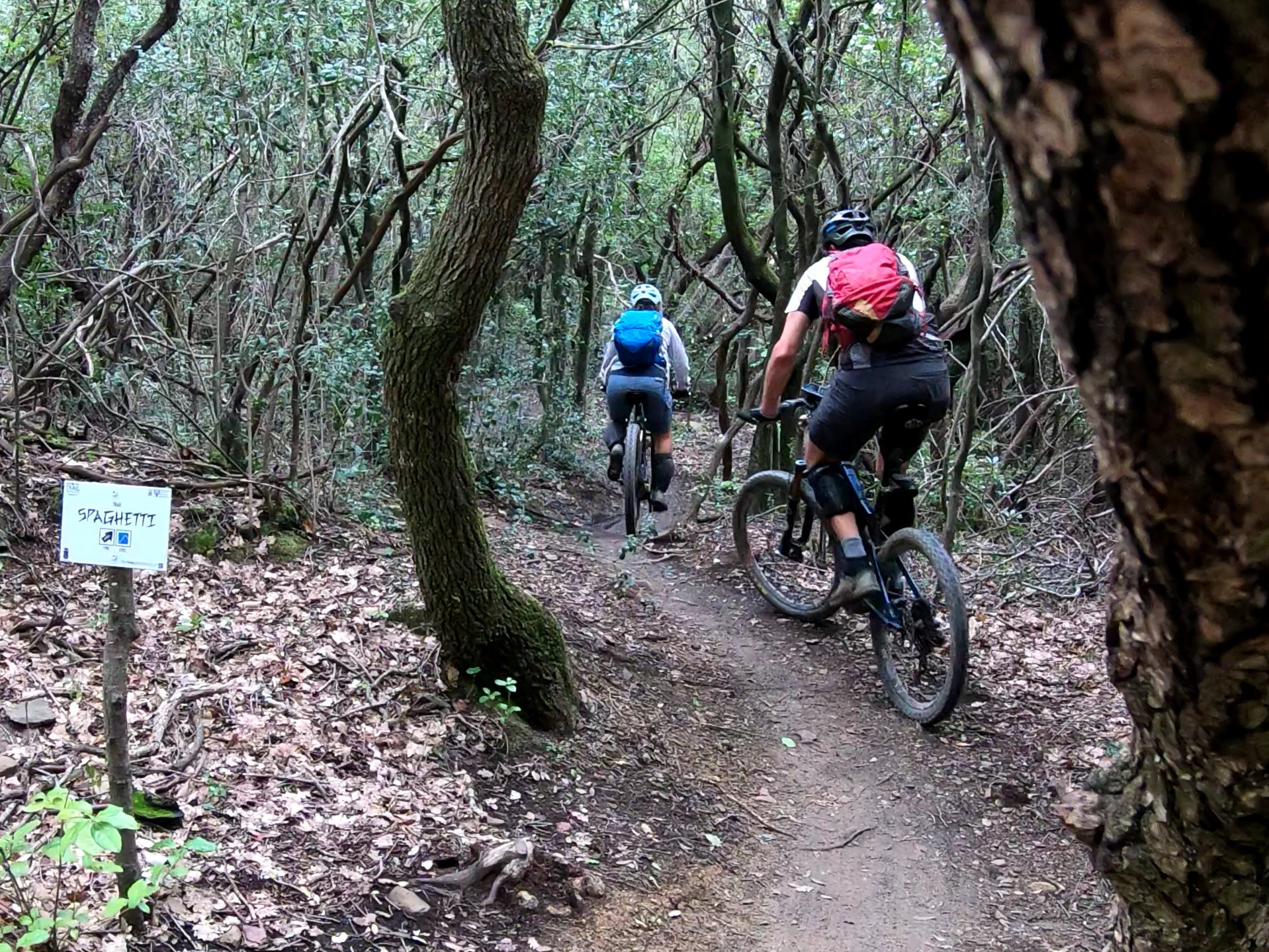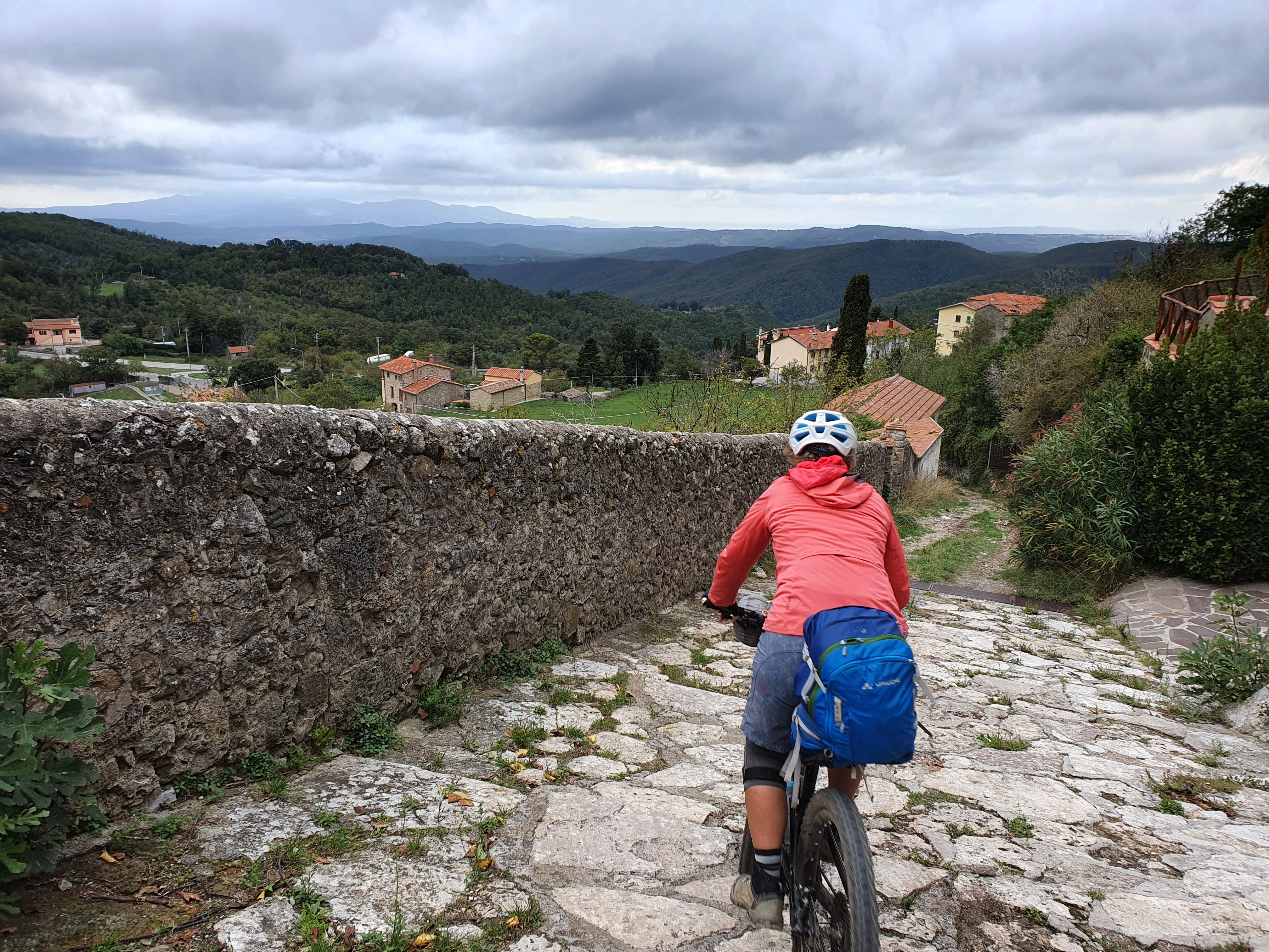 Der stürmische Nachmittag findet uns auf dem nächsten Hügel bei Massa Marittima: Über den Spaghetti-Trail strampeln wir hinauf auf den Monte Arsenti. Sind immerhin dreihundertfünfzig Meter Höhenunterschied, mehr Abfahrt bekommt man hier nicht. Dafür gibt's Singletrack für den Weg nach oben.