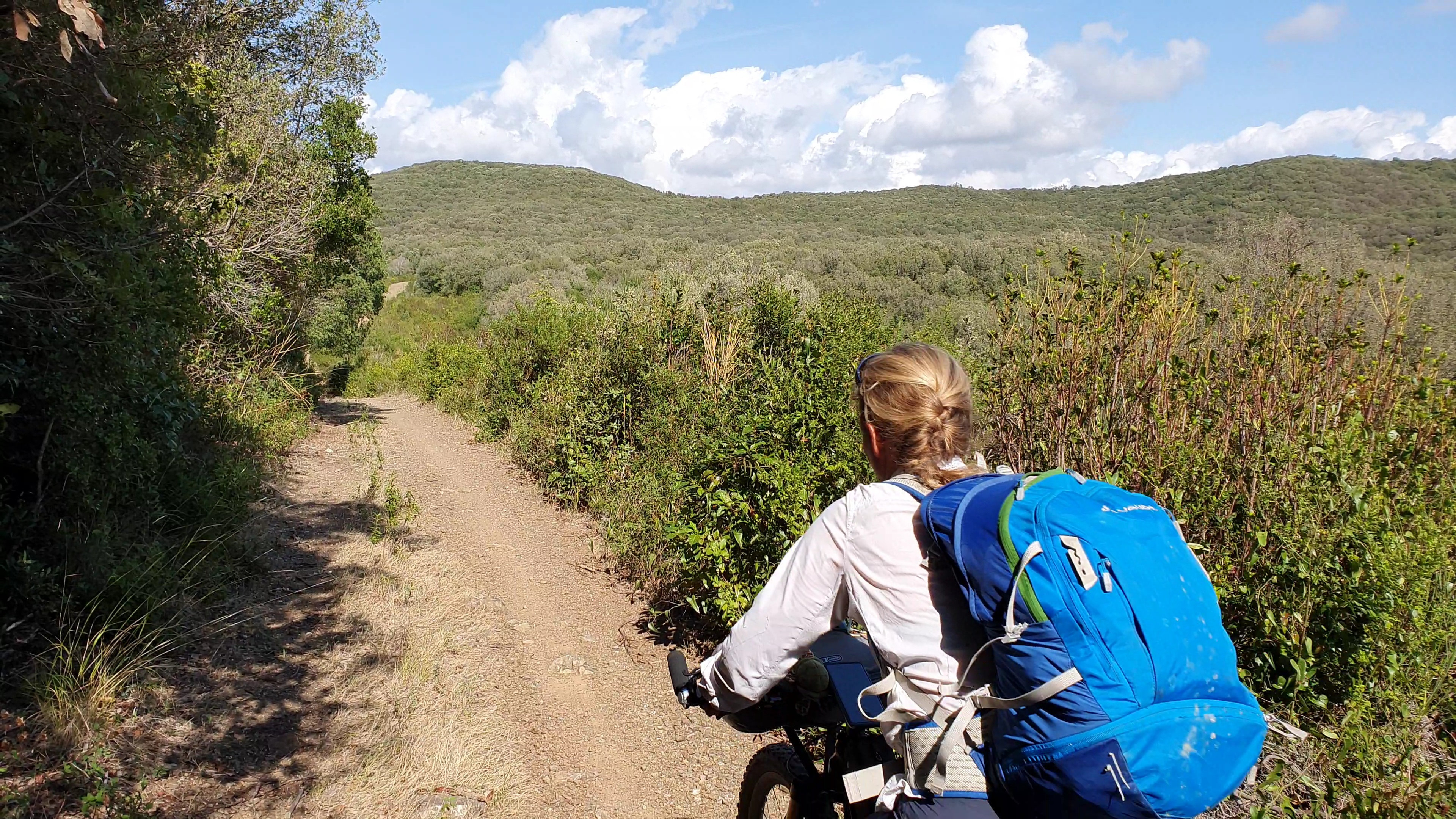 Auf Wiedersehen Mittelmeer, hallo gestrüppige Hügel. So werden die nächsten Tage vermutlich alle aussehen, mehr ist in der Gegend von Massa Marittima nicht zu holen. Wir radeln trotzdem mal irgendwo rauf: Die "Montioni Trail Area" bietet sich als Verbindung ab Follonica direkt an.
