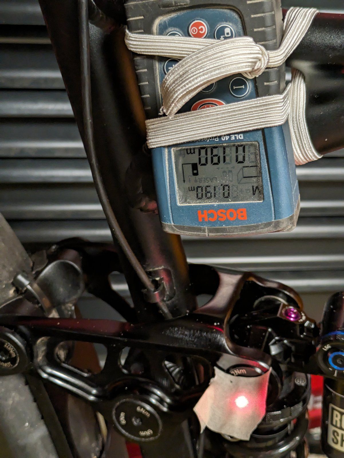 Der Laserdisto speichert die größte Distanz. Wenn man sich also vorsichtig aufs Bike setzt, kann man den statischen Sag ablesen.