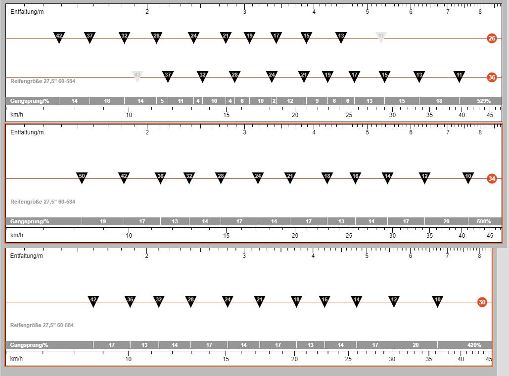 Hier mal der Ritzelrechner und der Vergleich meiner aktuellen 2x11 sowie der 1x12 vom Al 6.0 Race und dem CF 8.0 Race sowie der 1x11 vom CF 7.0: