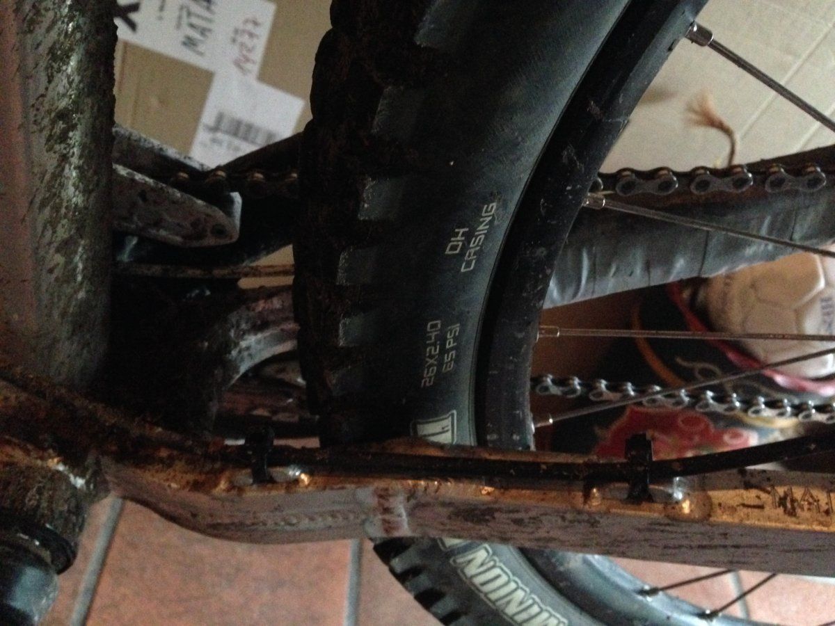ich habe auch noch mal eine Frage - gekauft habe ich das gute Stück als "26er" und bin in den letzten Wochen damit beschäftigt ein paar unterschiedliche Reifen und vorallem, die korrekte Kettenstrebenlänge (Position der Ausfallenden) auszuprobieren. Wenn Ihr Euch nun meine zwei Beispielbilder anseht ... der Reifen schleift fast an den U-Profilen (könnte mit dem Schlitten der Ausfallenden noch vielleicht 10-13mm nach vorne) - dann wäre meiner Meinung nach immer noch fast ausreichend viel Platz für zumindest einen 650B Laufradsatz. Hat das mal einer von Euch probiert? Ich müsste es nur wissen, das es funktioniert - dann fahr ich eben 27,5" .... sicher auch nicht verkehrt