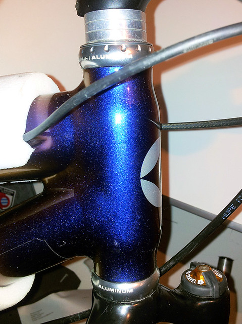 Gestern kam der neue Steuersatz. Wurde mit meinem selbstbau-Gewindestangen-Holzplatten-Einpresswerkzeug schadfrei eingepresst...wenn ich auch wohl etwas schief dabei geschaut habe...leicht versetzt die Lagerschalen vom Schriftzug...