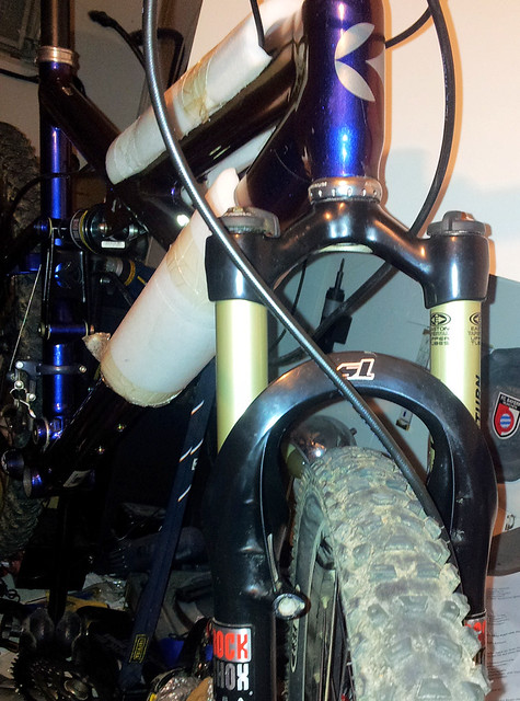 Dafür gibts an anderer Stelle Material ganz im Sinne des neuen Besitzers: Federgabel bis 125mm. Mal sehen, ob das die Karre mitmacht, aber man kann sie ja bis 85 runterdrehen. Bis 100 sollte es eigentlich ganz normal fahrbar sein, auch wenn serienmäßig glaube ich 80ger drin waren...aber sobald für mein Palomino der weiße Steuersatz da ist, kommt dort ne weitere TALAS rein und ne F100RLC bleibt übrig. Wenn der "Alte" überall FOXe verbaut, will er das natürlich auch...