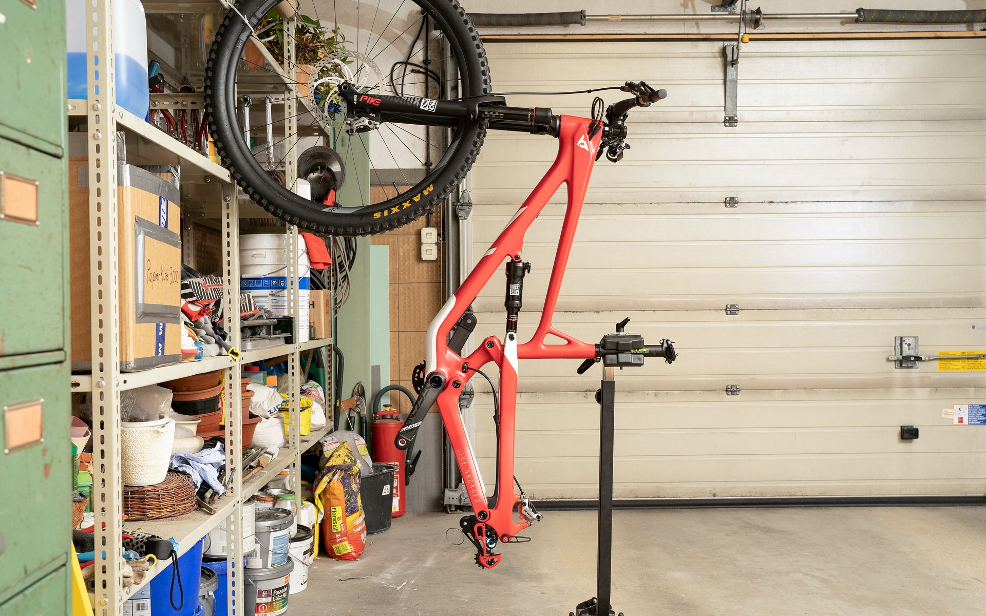 Das Bike ist jetzt übrigens zu 98% fertig. Die Reifen sind tubeless aufgezogen (was Maxxis/Newmen-typisch kinderleicht und mit Billig-Standpumpe ging [gut, bei 1kg Reifen ist das auch keine Kunst]), Revive ist drin (läuft wie ein Traum) und sämtliche Verkabelungen erledigt. Jetzt nur noch Kette kürzen, Schaltung einstellen und evtl. noch eine andere HR-Steckachse rein.