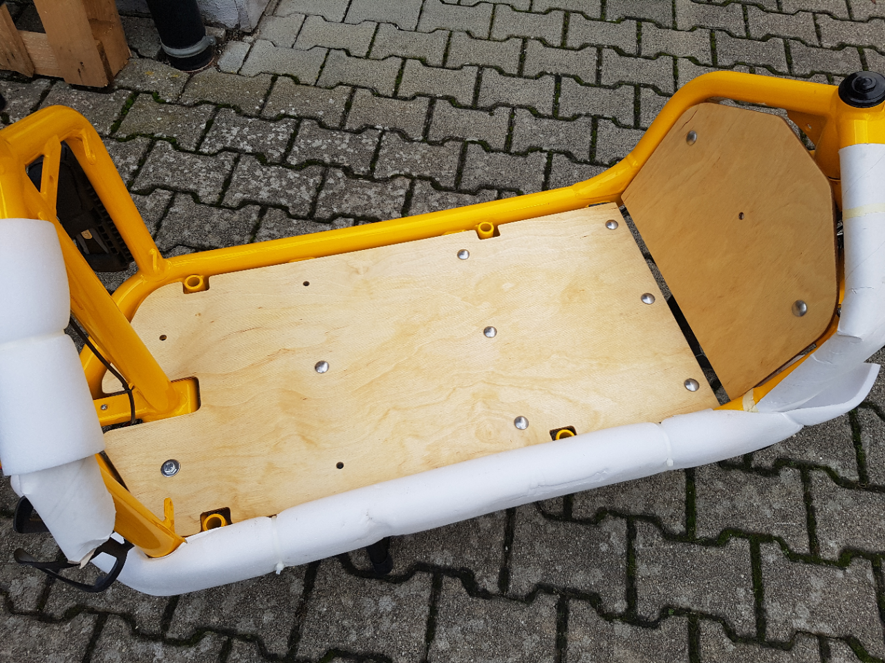 So ähnlich habe ich das nun auch gelöst, vier Kunststoff-Unterlegscheiben mit je 1,5mm und schon hab ich dort keine Probleme mehr. Leider geht dabei halt auch Ladefläche bzw. Fußraum verloren. Gerade bei so einem Riesensitz wie unserem wird's dann schnell eng. Meine Idee war, erstmal zu versuchen, mit der Fräse eine Aussparung im Konfilktbereich zu machen und das Schutzblech etwas näher an den Reifen zu montieren. Zur Not könnte ich mir auch vorstellen, das Brett an der Stelle ganz weg zu sägen und auf das Brett ein dünnes Alublech zu schrauben. Weil am Ende ja Griptape drauf soll merkt man davon ja eh nichts.