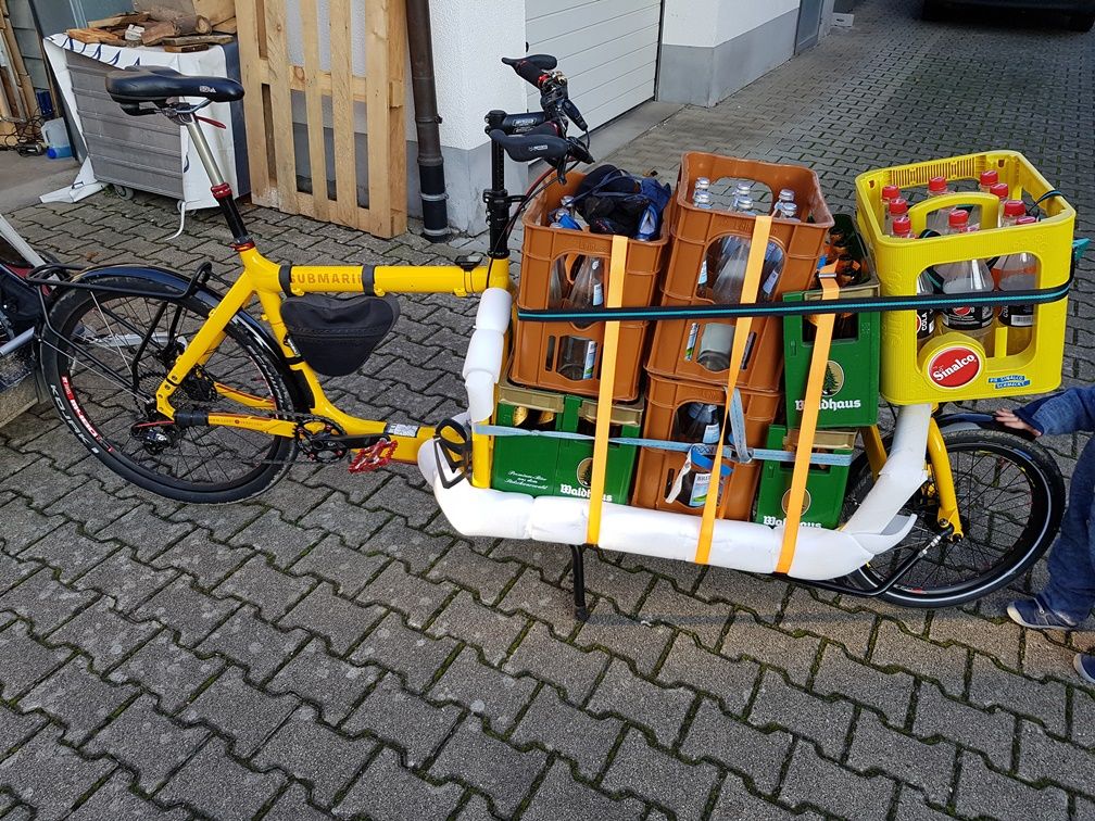 So sieht es übrigens aus, wenn ich Getränkegroßeinkauf mache (wobei ich mehr leere Kästen drauf hatte als volle), aber mit Kind im Anhänger kommt da ordentlich Gesamtgewicht zusammen, macht an Rampen mit hoher Neigung viel Spaß :wut: