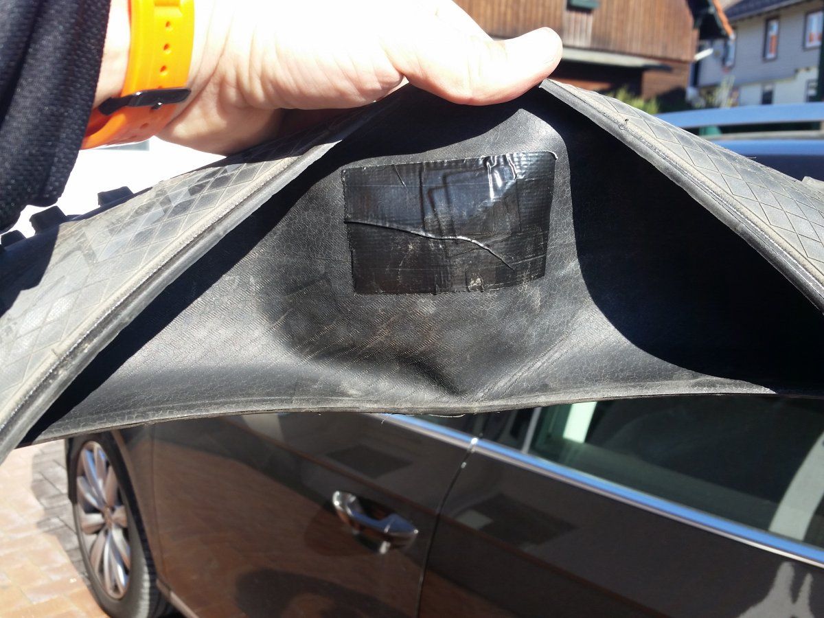 Mehrere Flicken und Panzertape schlossen die 2cm im Mantel.