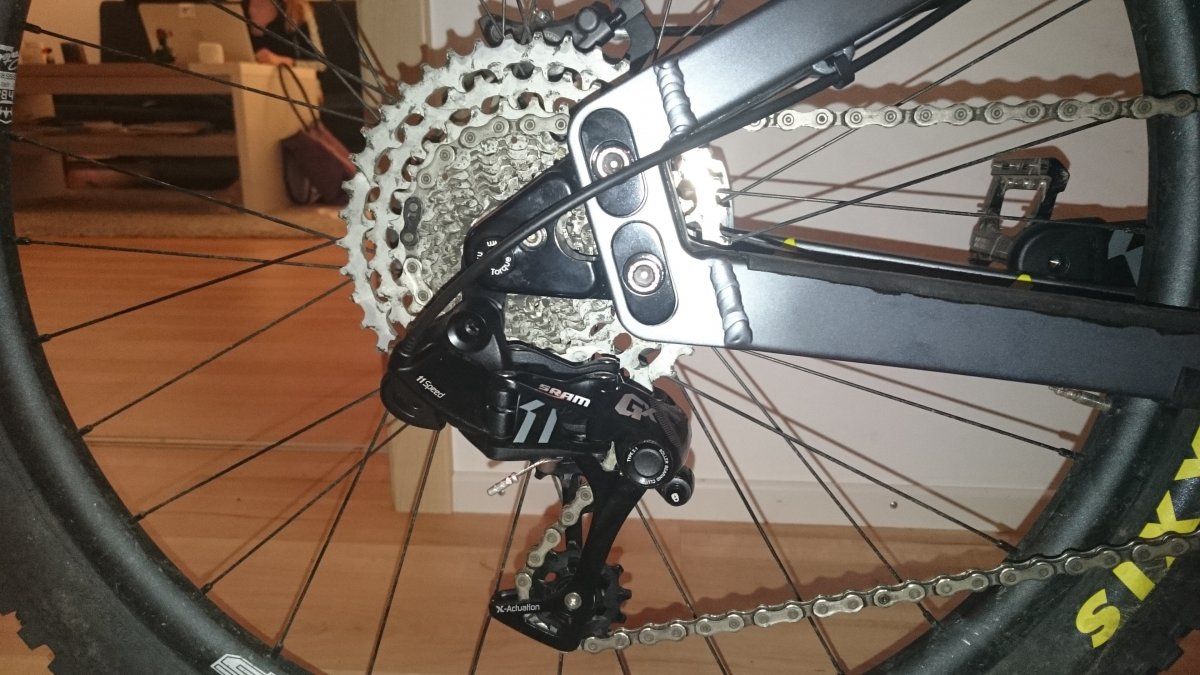 Wenn die Kette vorne auf dem kleinen 24er Kettenblatt ist, schleift sie an der Kettenstrebe entlang, sobald ich auf das 15er Ritzel (vor vor letztes) oder tiefer schalte - Wie man auf dem Foto sieht.