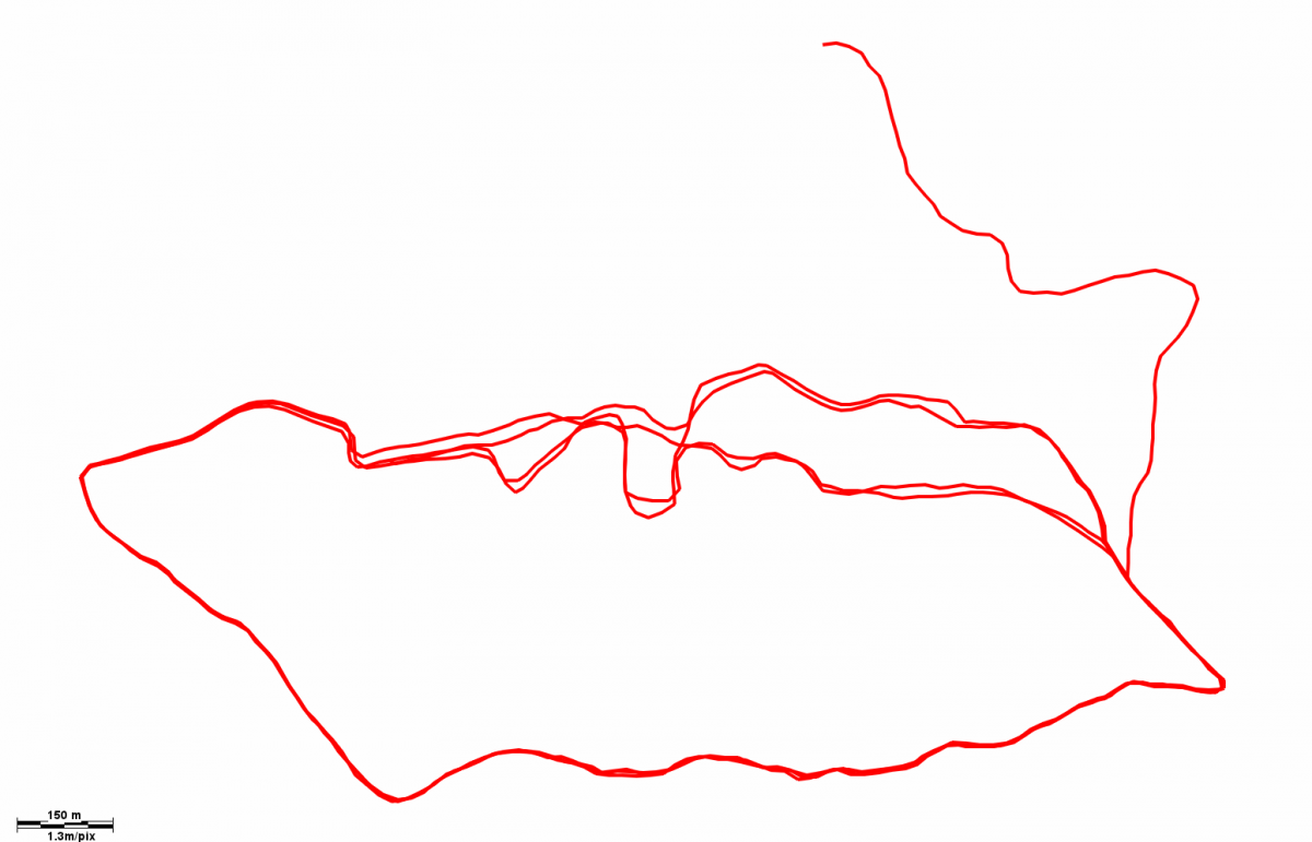 Im oberen Bereich bin ich zwei verschiedene Wege gefahren, jeweils zwei mal. Diese kreuzen sich zwei mal. Die Wege sind so schmal, daß keine Schneise im Wald zu sehen ist. Und die Tracks liegen irgendwo in der Gegend.