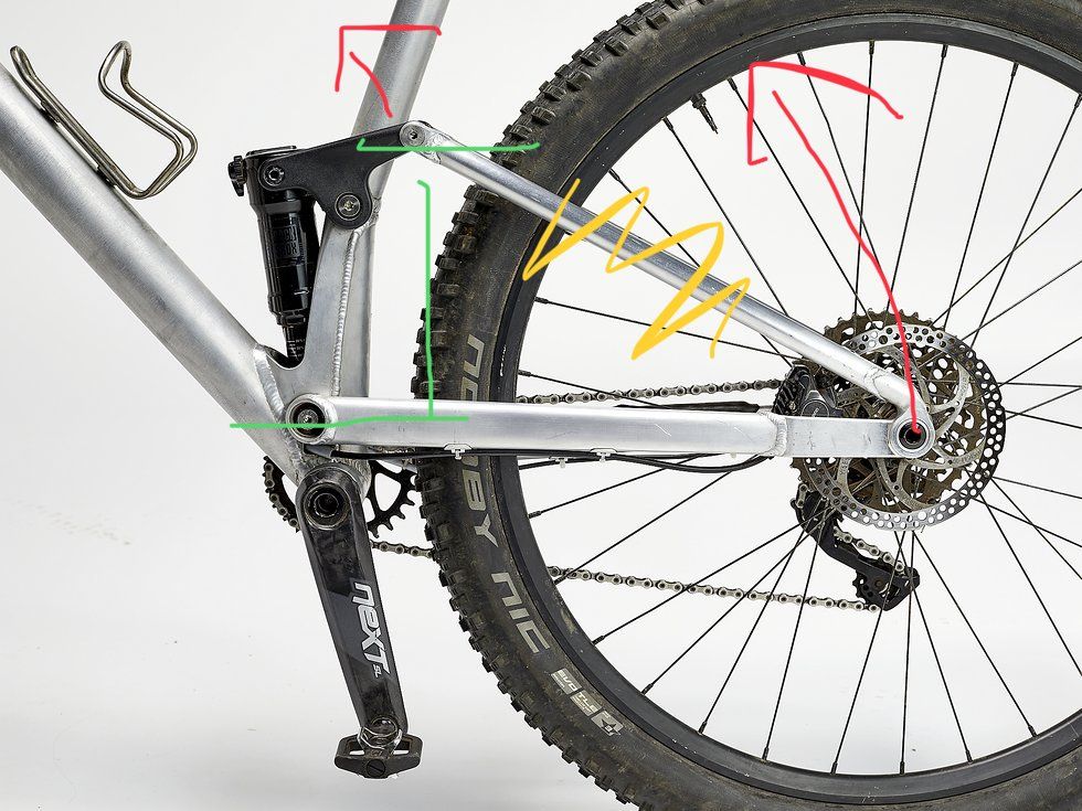In dem Moment ändert sich der Abstand zwischen den beiden grünen Linien. Und somit muss der Winkel im Dreick des Hinterbaus an der Hinterradachse größer werden. (Mist, da habe ich vergessen einzuzeichnen). Folglich müssen sich die Sitzstreben „bogenförmig“ bewegen, sprich flexen.