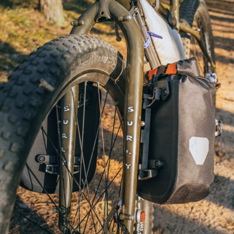 Ich habe die Widefoot cargomount montiert. Die sind ein bisschen zu klein für die 8 Liter Drybags die ich verwende, aber mit jeweils drei Voile Straps funktioniert das bei mir. Grösserer Cage und kleinere Taschen wäre aber wohl optimaler.Kann mir vorstellen, das das noch mit einer kleinen Rolle, bzw. kleinem dry bag passt. Würd ich auch den Ortlieb Fork Packs vorziehen, da kompremierter. Wäre neugierig wie weit das auszureitzen ist, 5, 8, 10L...