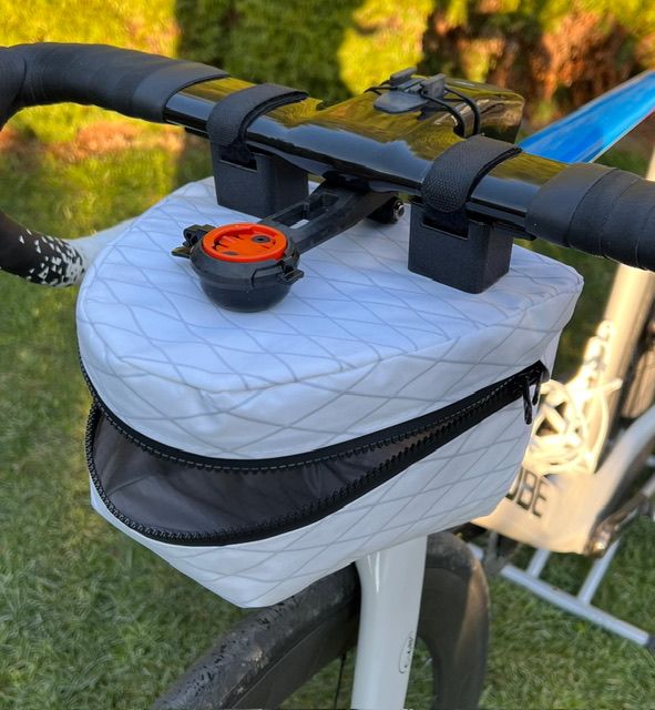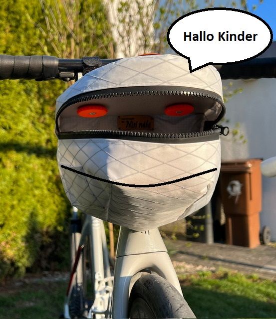 In der Tasche ist oben eine Platte(auch aus dem Drucker) und hält die Oberseite so gerade und stabil. 2 M4 Schrauben mit wieder gedruckten Rändelmuttern halten die Tasche an den beiden Haltern am Lenker fest.