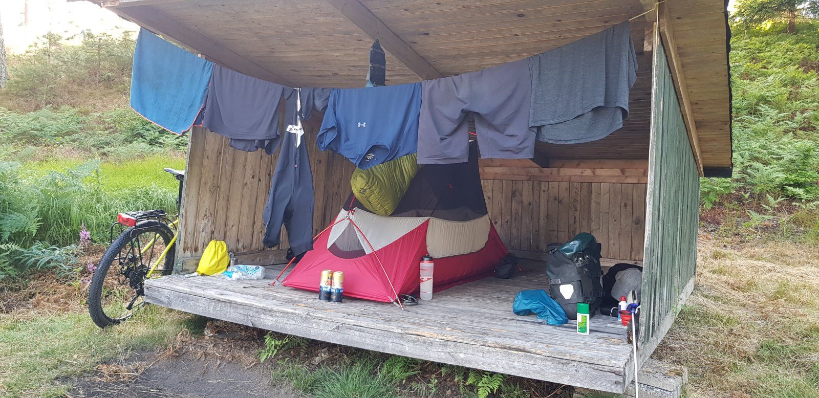 Tarp passen sogar 2 Hängematten, und auch die Bikes finden unter dem Tarp auf dem Boden platz. Man kann sich in der HM gegenübersitzen während der Regen draufprasselt, oder lümmelt einfach nur ab - die Bikes im trockenen. Komfortmäßig ist das schon ein Upgrade finde ich, da man einfach Platz hat unterm Tarp, und nicht auf dem Boden rumkriechen muss.