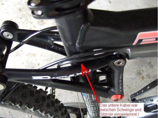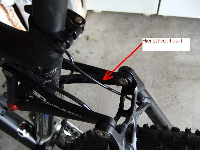 Nun ist mir aber auf Hinweis von RTom(der das selbe problem hat) aufgefallen das die Bremsleitung und der hintere Schaltzug am federnten Hinterbau scheuert. Diese stelle ist nicht gerade abgerundet sondern doch recht scharfkantig. Bild zeigt Schaltzug nach ca 60Km!