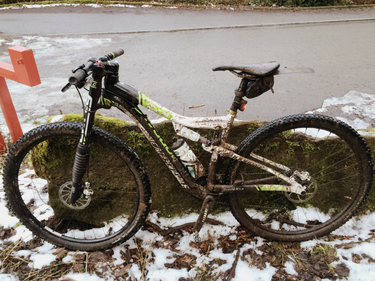 Weil es einfach ein geiles Bike ist und super funktioniert - mal wieder ein Bild im Used-Look. Gewicht liegt mittlerweile bei 10,5 kg raceready. Lediglich die Bereifung am VR kommt bei den aktuellen Witterungsverhältnissen an seine Grenzen.