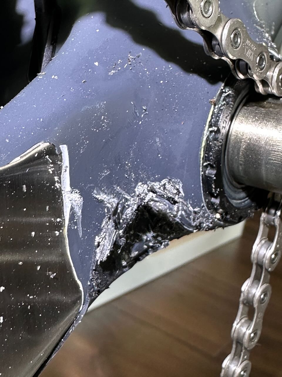 Das Rad hat ca. 8km auf der Uhr. Bei der ersten richtigen Ausfahrt heute sprang die Kette beim Schalten vom großen auf das kleine Ritzel vorne vom Kettenblatt nach innen und hat sich in den Rahmen gefressen.Was muss denn bitte passieren, dass die Kette ein riesen Loch in den Carbonrahmen frisst?Das sieht ja nach einem Totalschaden aus.