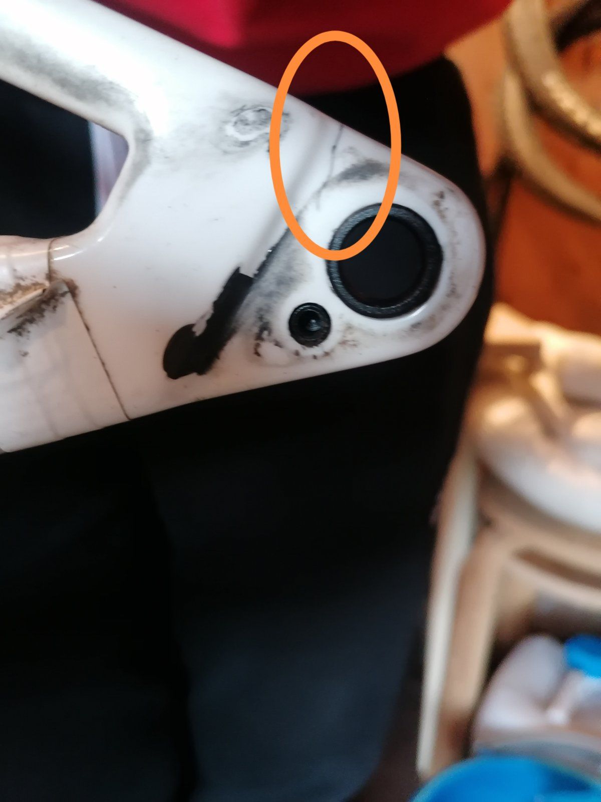 Beim Ausbau der Steckachse kam mir das Schaltwerk entgegen, da das Gewindestück am Gegenhalter abgebrochen ist. Bei näherer Untersuchung habe ich dann massive Lackabplatzer an der Ausfallenden festgestellt bzw. einen Riss im oberen Bereich der Halterung.