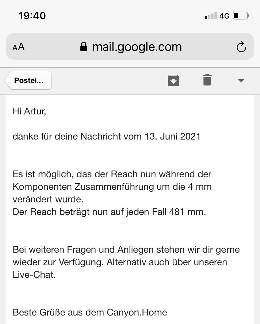 Hier übrigens noch die Antwort von Canyon. Habe ihnen die selbe Frage gestellt. Hört sich ein wenig unsicher an das GanzeIk denke die haben meine Zeichnung gesehen.