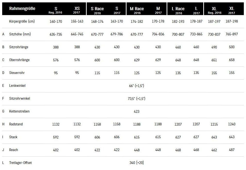 Frage an alle, kann es sein dass das strive 2017 nur noch in der "race" geo zu haben ist, bzw. Gar nicht mehr zwischen regular und race unterschieden wird? Zumindest erscheint mir das so, wenn ich einen blick auf die geo tabellen der 2017er strive modelle werfe.