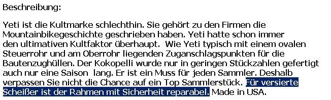 "Yeti ist die Kultmarke schlechthin. Sie gehört zu den Firmen die Mountainbikegeschichte geschrieben haben. Yeti hatte schon immer den ultimativen Kultfaktor überhaupt. Wie Yeti typisch mit einem ovalen Steuerrohr und am Oberrohr liegenden Zuganschlagspunkten für die Bautenzughüllen. Der Kokopelli wurde nur in geringen Stückzahlen gefertigt auch nur eine Saison lang. Er ist ein Muss für jeden Sammler. Deshalb verpassen Sie nicht die Chance auf ein Top Sammlerstück. Für versierte Schei$$er ist der Rahmen mit Sicherheit reparabel. Made in USA."