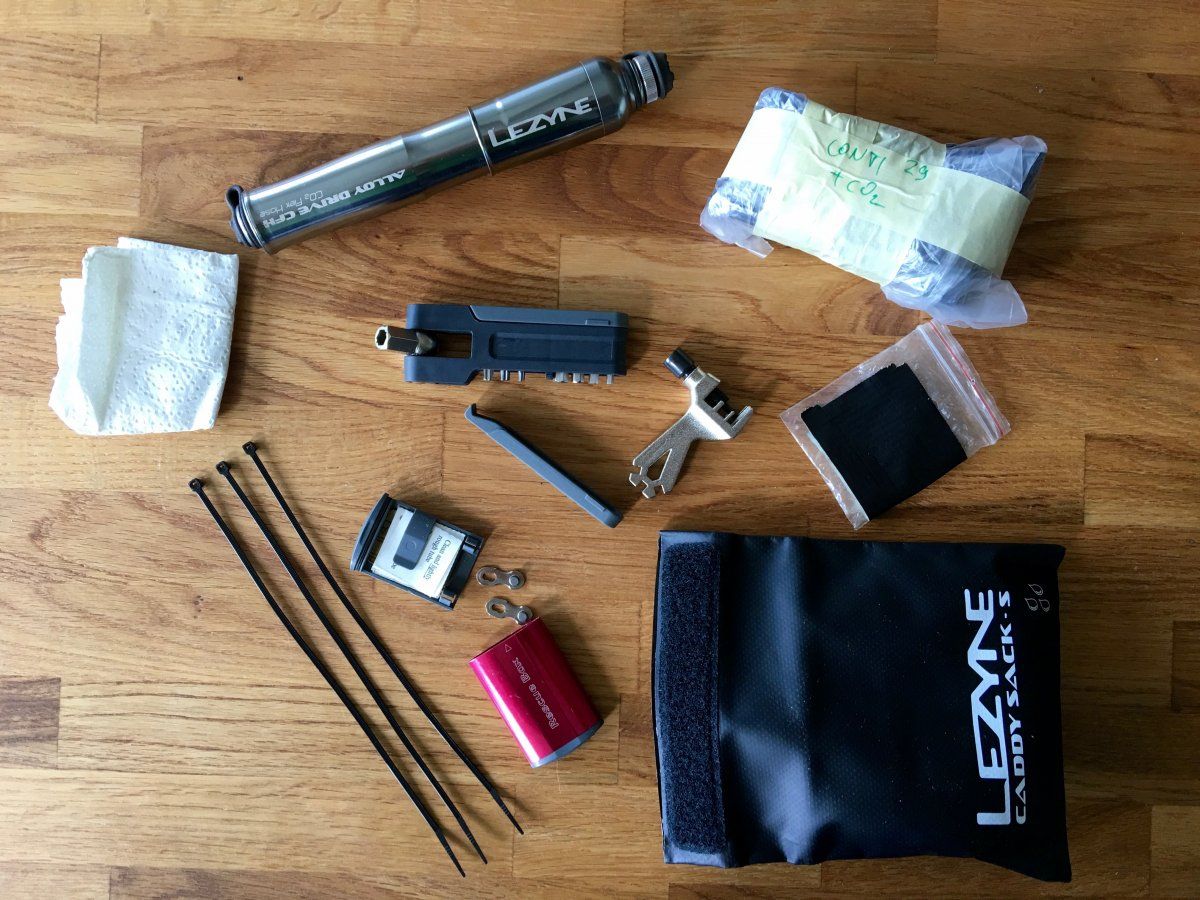 • Wasserdichten Lezyne-Minibeutel mit Flickzeug, L-Bithalter und den nötigen Bits, Mini-Kettennieter in die Trikottasche