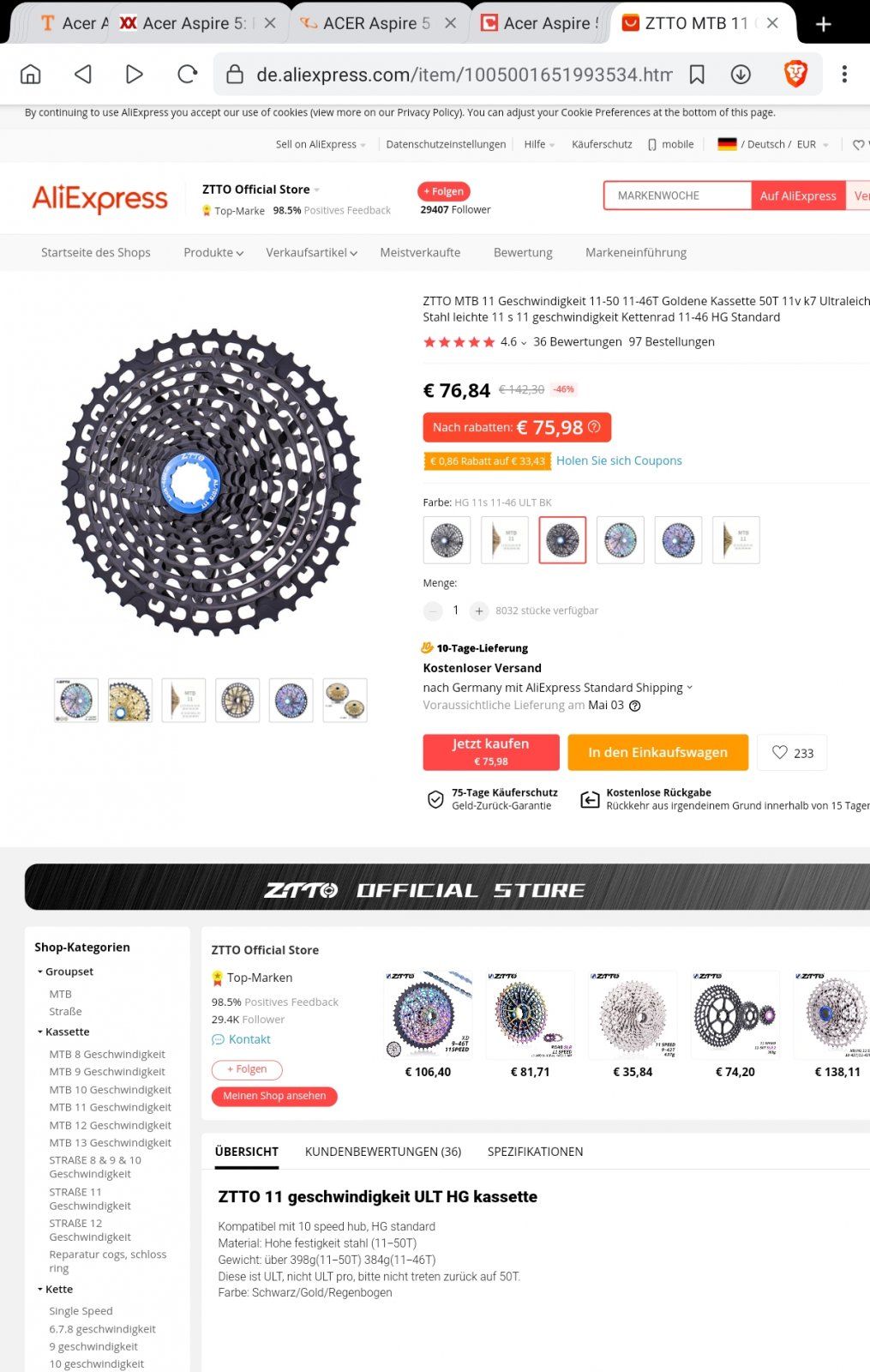 welche hast da jetzt genau genommen?Gestern die leichte 11fach 11-46 Kassette von ZTTO montiert und heute morgen gleich 30km Testfahrt. Bestellt im ZTTO Shop. Die Kassette hat den 46er Kranz aus Alu genietet, der Rest ist aus Stahl und ein! Stück aus dem Vollen gefräst. Gewicht 380g. Abstufung wie Sunrace, nicht wie Shimano, daher angenehmer zu fahren. Schaltet rauf und runter exakt, schnell und fast geräuschlos. Montage einwandfrei, läuft sauber und exakt ohne Schlag.
