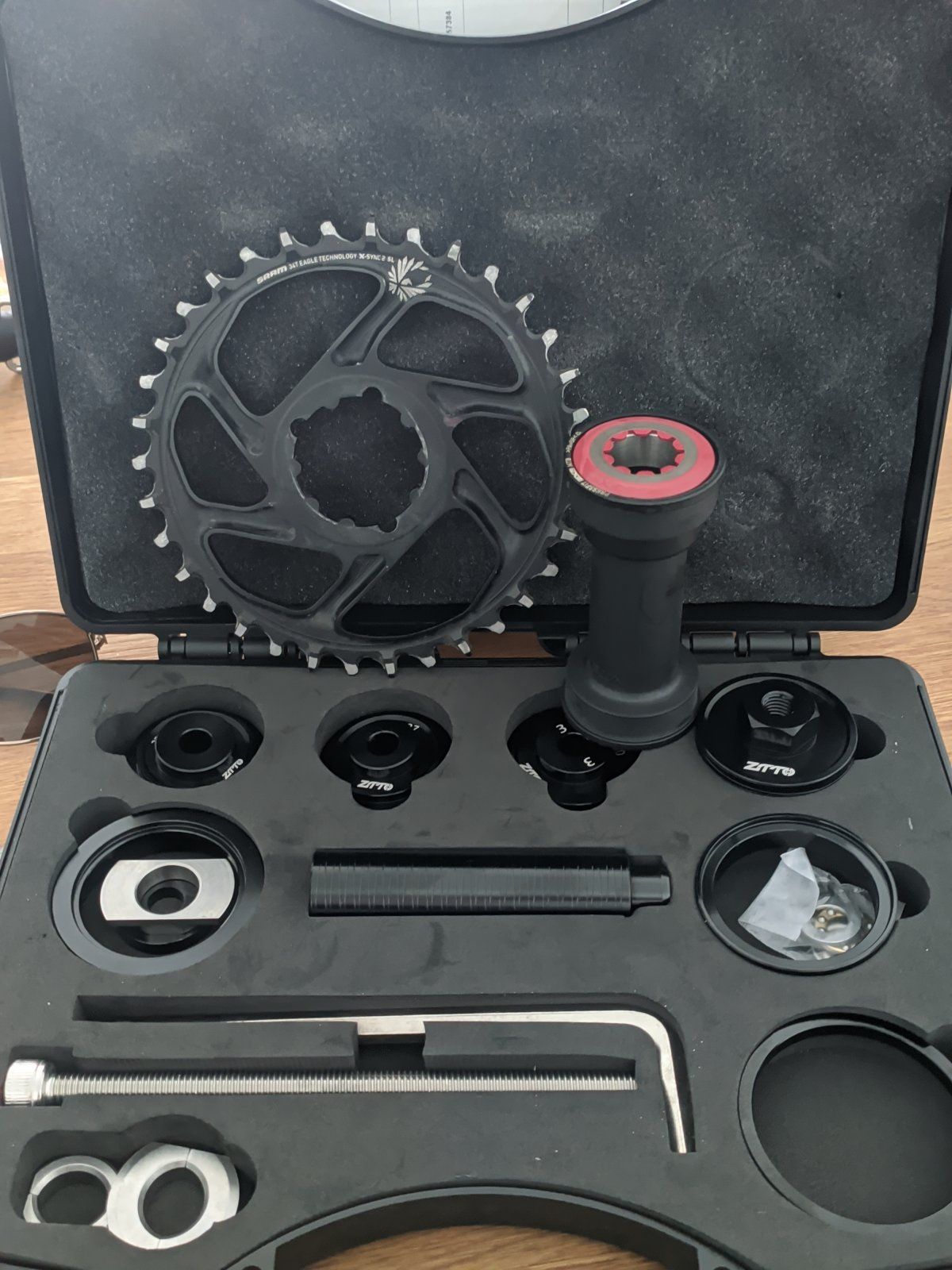 Die Schaltung ist eine Apex1. Die Kurbel ist eine Somax (??? Noch nie gehört) mit 46er KB.Denk bitte an die Kettenlinie, die Apex1 hat 45,5, die goldix-kurbel 43,5. Brauchst also ein passendes Kettenblatt mit Offset.