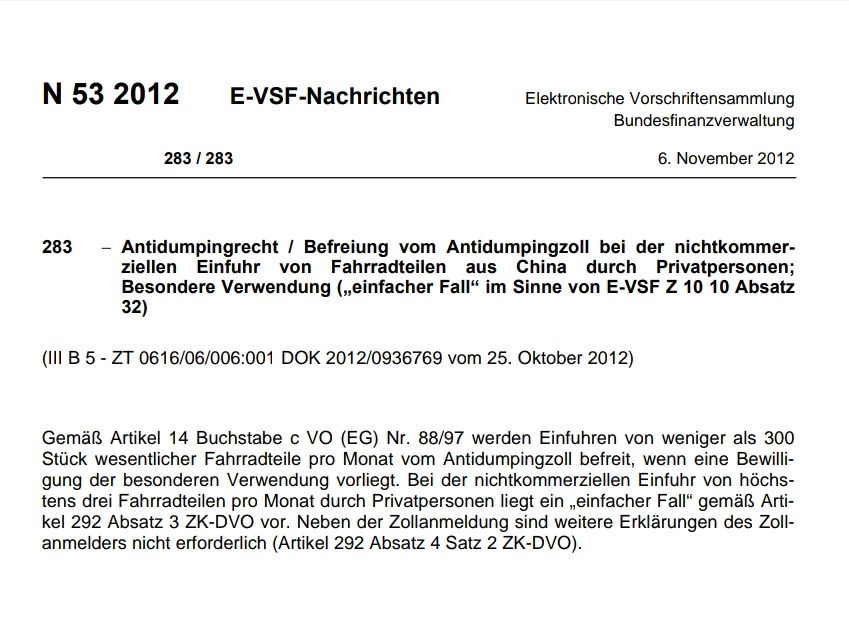Ich muss allerdings zugeben, dass ich diese Aussagen nicht validieren kann. Das ist alles wenig hilfreiches Halbwissen. Weder der Blick in die aktuell gültige ZK-DVO (Zollkodex-Durchführungsverordnung) hilft mir da weiter. Noch konnte ich in der E-VSF (Elektronische Vorschriftensammlung Bundesfinanzverwaltung) etwas finden. Letztendlich läuft es auf die Frage raus: Was muss ich in der Zollanmeldung wo angeben bzw. reinschreiben, damit der freundliche Beamte hinter dem Schalter weiß, dass er mir keinen Antidumpingzoll abzuknöpfen hat. Zumal es für Fahrradrahmen sogar Freikontingente gibt, d.h. bei Anwendung dieser gar kein Zoll anfallen soll. (Einfuhrumsatzsteuer bleibt natürlich).