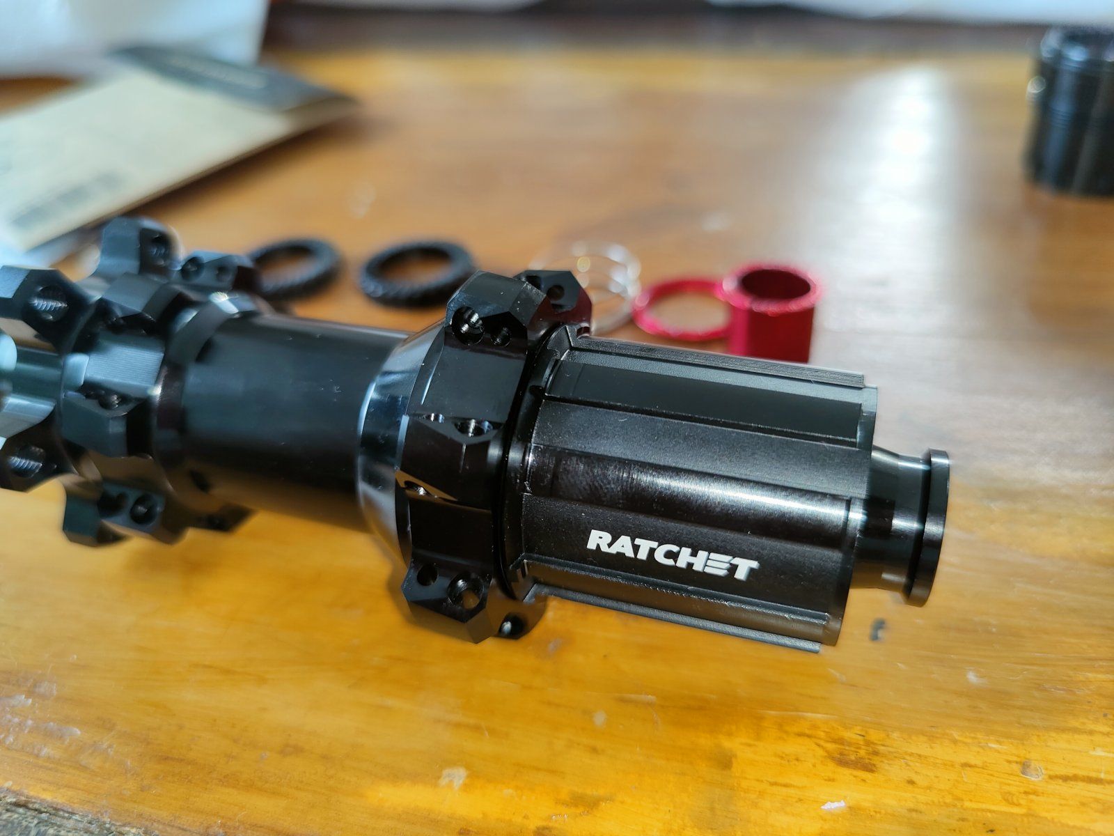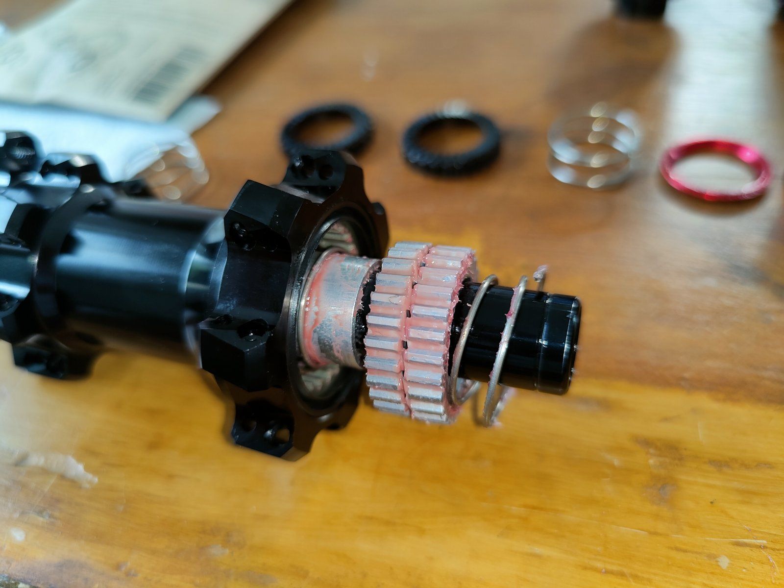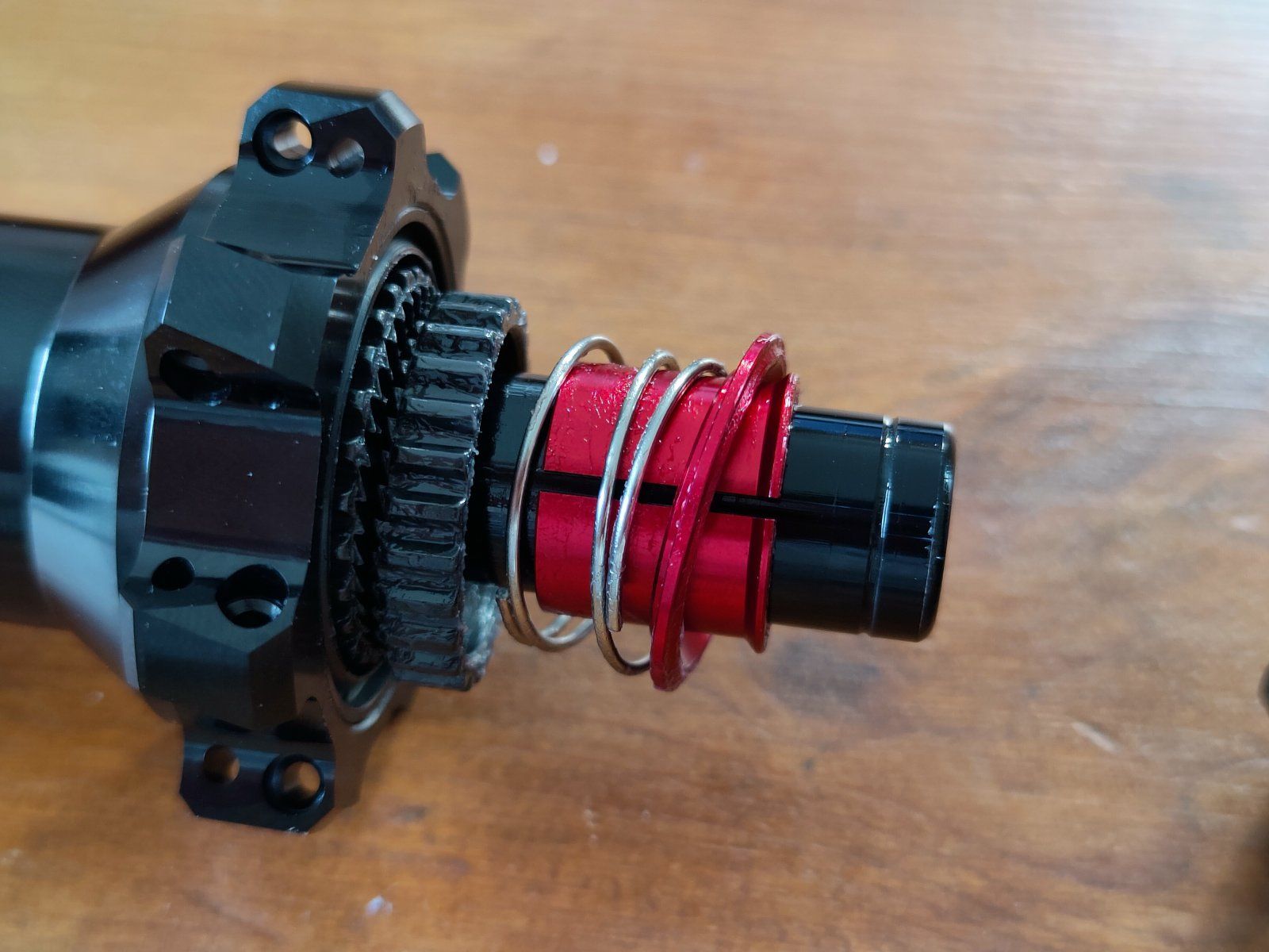 Ratchet ähnelt dem von DT, ist jedoch anders auf der Welle befestigt. Roter der das Ratchet zentriert besitzt einen Kragen und einen roten Sicherungsring. Federn sind nicht konisch. Dichtungsaufbau am Freilauf sieht etwas einfacher aus als bei DT. DT hat hier wohl eine Labyrinthdichtung.