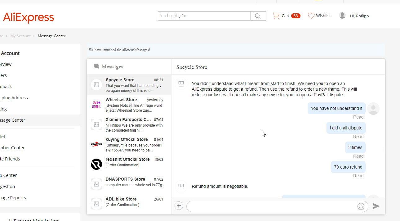 Spcycle besteht darauf dass ich ihnen den Betrag aus dem Aliexpress Refund schicke um ihre Verluste kompensieren.