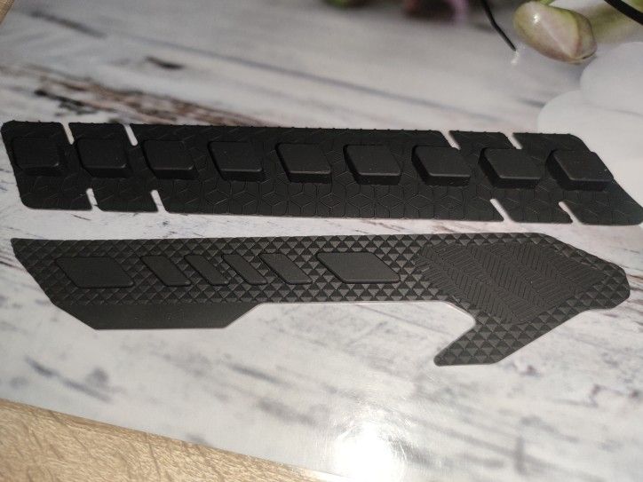 Dickes, anschmiegsames Gummi mit starkem Kleberücken. Legt sich top um die Kettenstrebe.