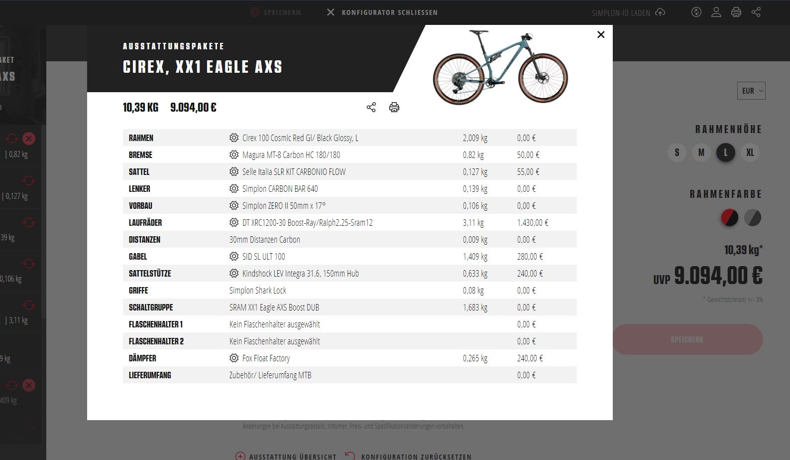 komme bei mir auf~8550,- mit allem drum und dran (komplett axs, piccola, newman king/kong, beast lenker usw.) ganzen teile: https://www.mtb-news.de/forum/t/elektronisches-racebike-mit-dem-ziel-von-unter-10kg.937900/