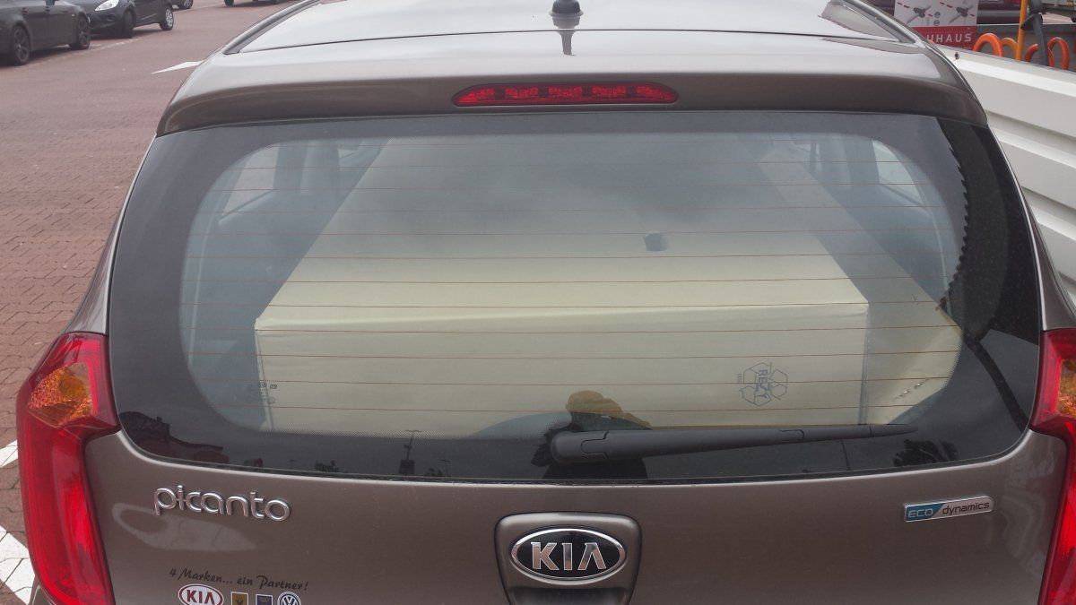 In anbetracht dessen, dass unser Händler heute Nachmittag geschlossen hat, bin ich eben doch noch mit dem Picanto zur Abholung gefahren. Eng wars, musste den Fahrersitz auf Anschlg nach vorn schieben und die Rückenlehne senkrecht stellen.. und das mit 1,86m Körpergröße.