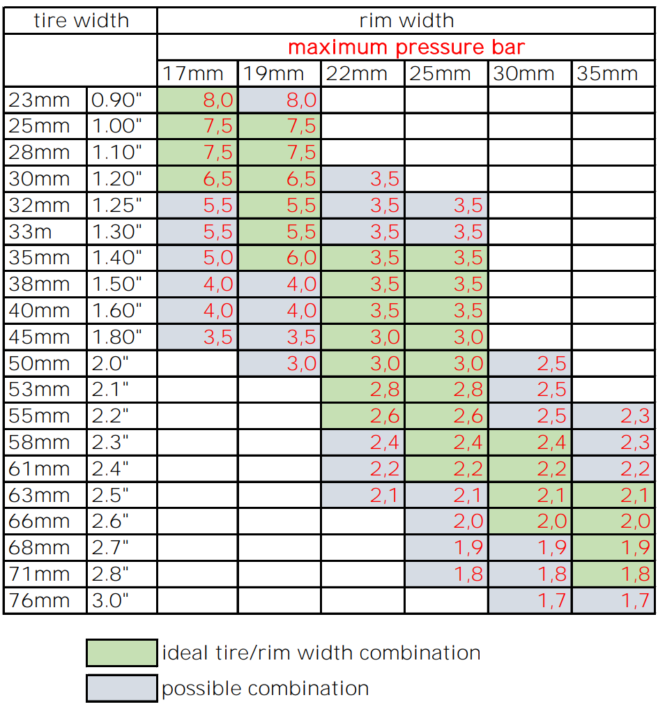 maximaler Reifendruck: 3,5 Bar (50 Psi) bei 35 mm Reifenbreite"